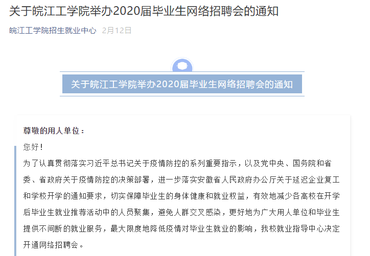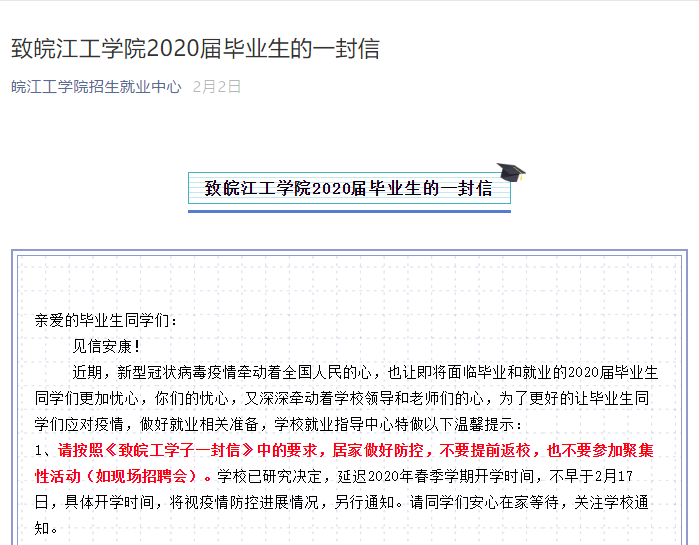 2月2日,学校就业指导中心迅速启动应急预案,及时通过学校就业网、微信公众号、QQ群等平台推送了《致皖江工学院2020届毕业生的一封信》。要求疫情期间毕业生们应做好居家防疫,并督促他们了解当前的就业形势,及时关注招聘信息,积极参与网络招聘。建议考研和考公的毕业生们及时关注相关招考通知。