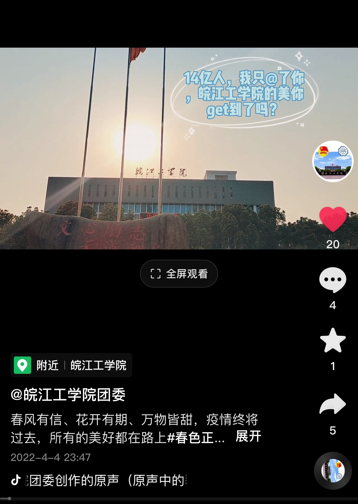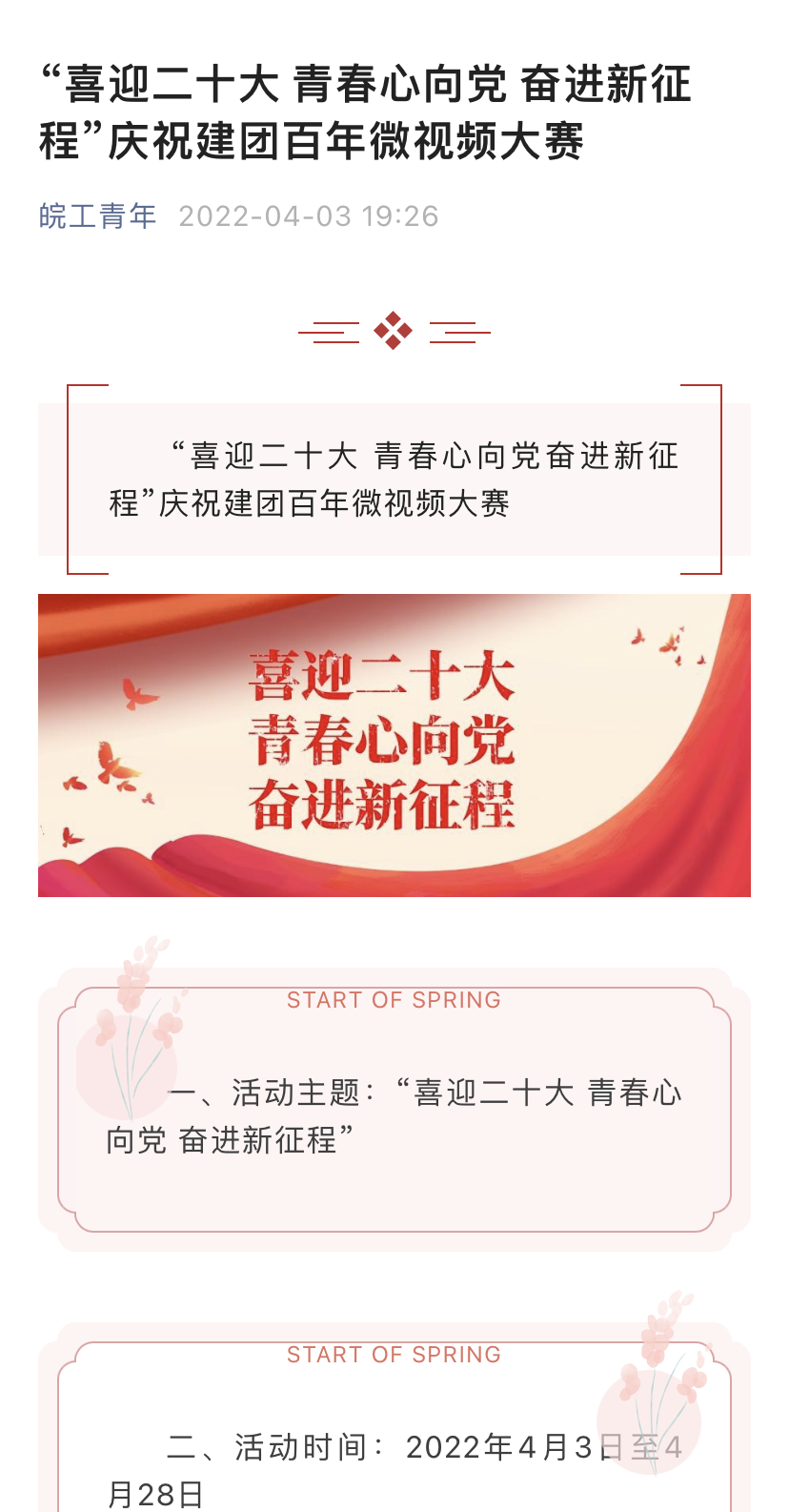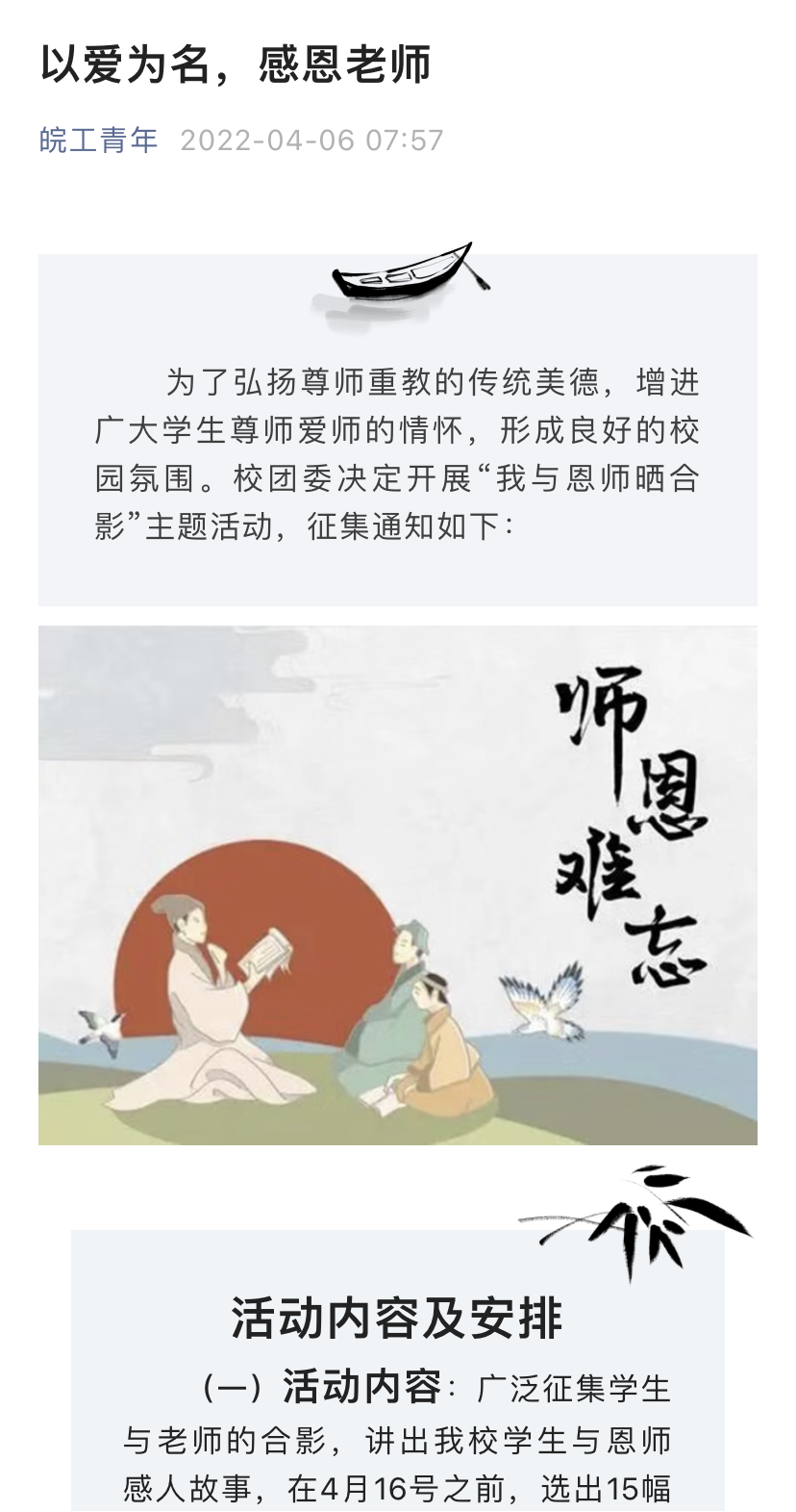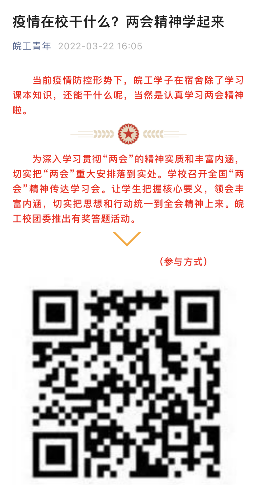 校团委坚守思想宣传主阵地,充分利用各级团属新媒体矩阵主动发声,开展正面宣传和引导,凝青聚力彰显战“疫”路上的青春担当。定期推送抗疫知识、宣传抗疫政策,开展“以爱为名、感恩老师”我与老师合影征集、“献礼建团百年微视频”征集、“喜迎校庆·情系皖工”征文、摄影、视频征集活动等,同时在新媒体平台上同步展示优秀作品。