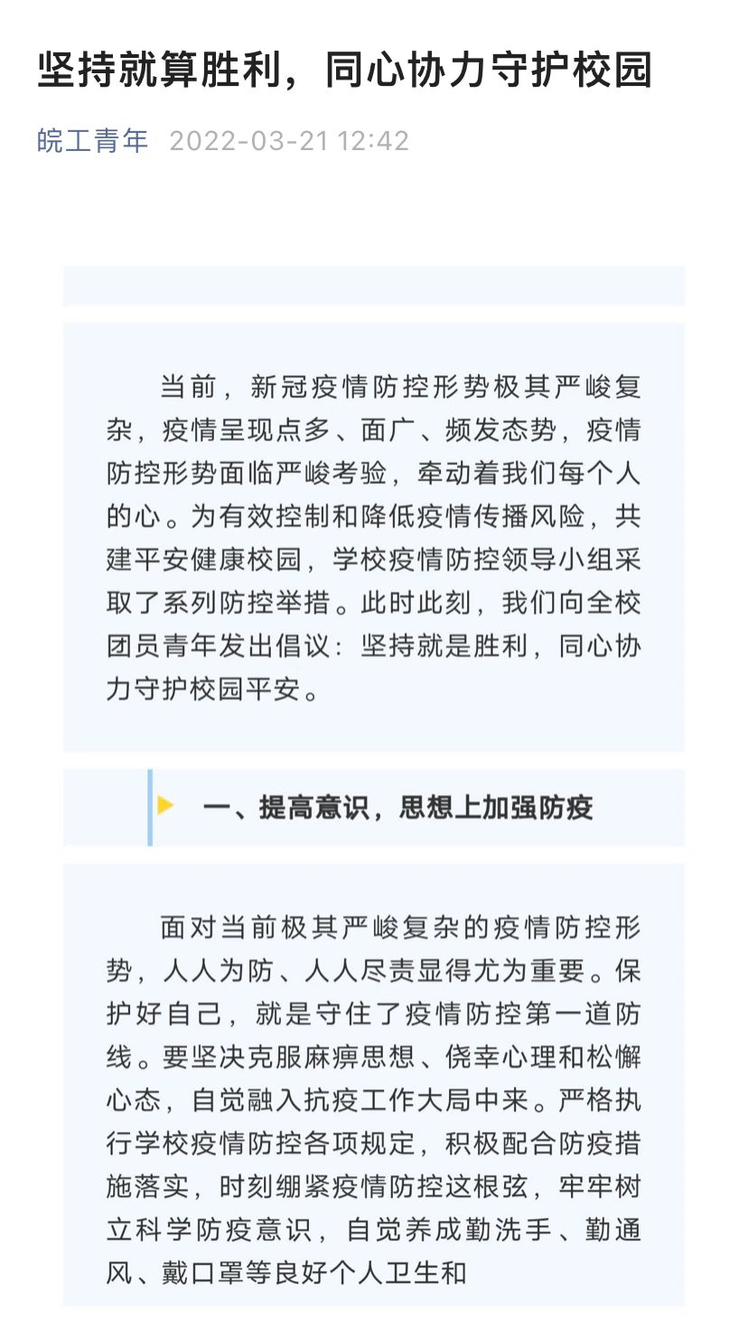 疫情发生后,校团委发出《关于招募“青年战疫”志愿者突击队力量的通知》,成立宣传信息、文体活动、文明纠察等志愿先锋队,确保校内志愿服务工作高效有序安全推进。建立校院两级团组织“线上线下”工作网络,先后向全校青年发布《疫情防控人人有责——致全体皖工青年的倡议书》、《疫情在校干什么?两会精神学起来》、《坚持就算胜利,同心协力守护校园》等通知,将组织力转化为抗击疫情的青春战斗力,号召各级团组织、团干部、团员青年扛起责任彰显使命担当。
