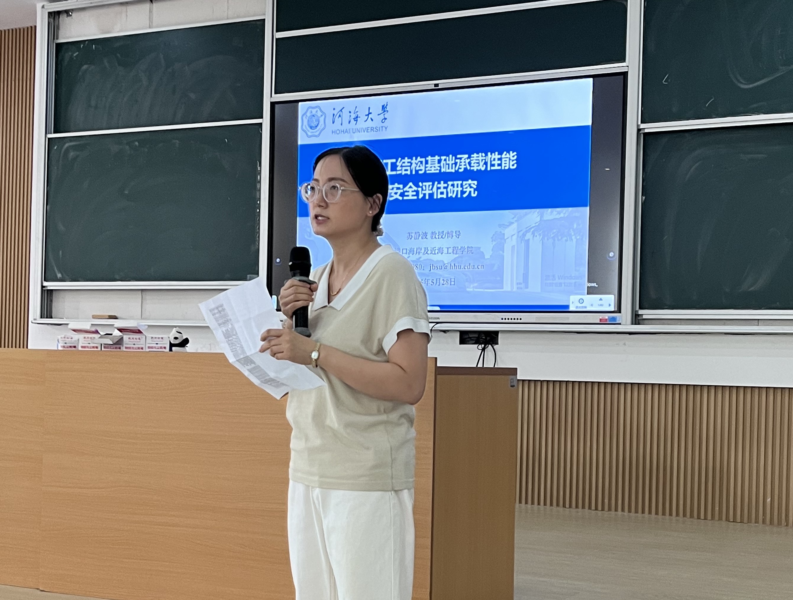 2025年5月30日下午,为深化学术交流、活跃科研氛围,我校学术活动月期间特邀河海大学港口海岸及近海工程学院苏静波教授开展 “港航海工结构基础承载性能与安全评估研究”专题讲座。苏教授以其团队前沿研究为脉络,系统解析港航海工结构安全保障技术,为师生们呈现了一场兼具学术深度与工程价值的知识盛宴。本场讲座由港航教研室主任吴灵君主持。