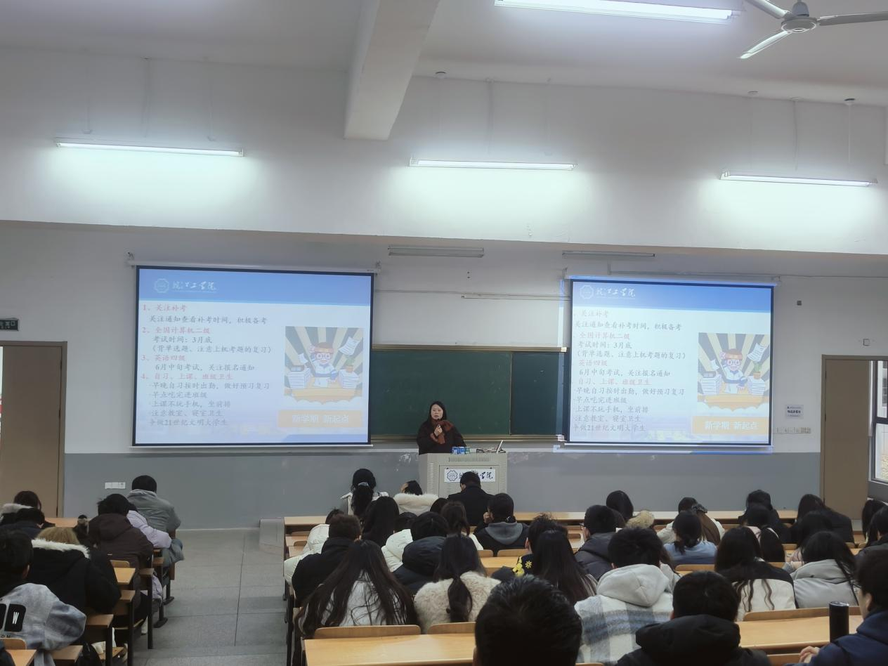 学业提升环节,班主任马子钊首先通报上学期补考整体情况,明确补考时间节点与违纪处理后果,着重强调补考是弥补学业漏洞、补齐学习短板的重要契机,严禁任何作弊行为,引导学生诚信应考、认真备考。针对计算机二级与英语四级考试,两位老师详细分析了两项证书对学位授予、考研深造及未来就业的关键影响,鼓励同学们树立目标、主动规划,积极备考、顺利取证。