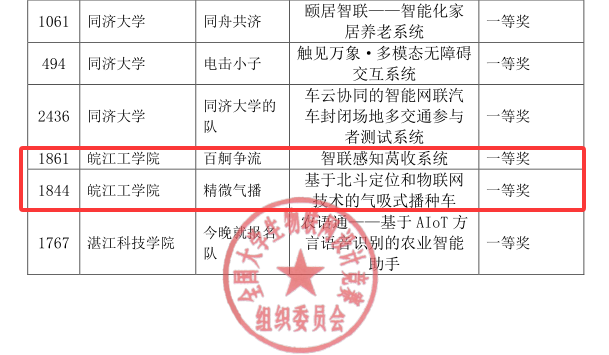 8月14日至15日,两支晋级队伍赴浙江大学紫金港校区参加现场决赛。决赛阶段,各参赛队伍需通过作品演示、技术答辩等多个环节全面展示其物联网创新设计与应用成果。皖工学子在比赛中沉着应战、发挥稳定,充分展现了出色的创新能力、实践能力和团队协作精神,其作品“智联感知莴收系统”和“基于北斗定位和物联网技术的气吸式播种车”获得评委的一致认可。最终,两支队伍双双斩获华东赛区一等奖,为学校赢得了荣誉。