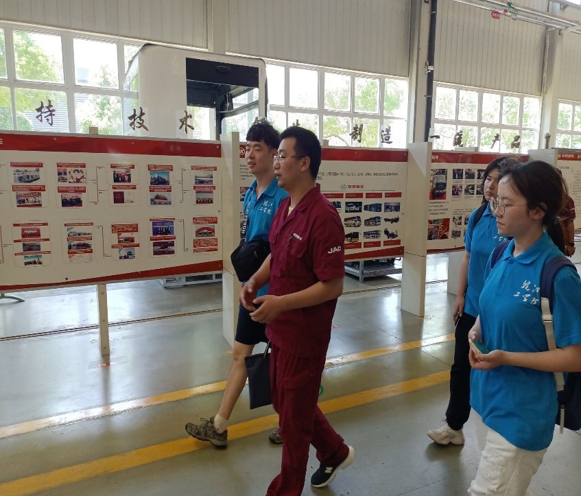 第四站定为安徽安凯汽车股份有限公司。在车间主任的带领下,团队参观了大巴,公交等车辆的生产线。团队更加直观地了解了车辆生产线流程的整齐化,机电化,对于一些机械器械有了一定的了解和使用技巧的掌握。车间主任也强调了以后新能源车辆的普及率将会进一步增大。团队的陈璐阳同学就新能源车辆以后的发展前景与车间主任进行了讨论。其间对话也让其余团队成员对于未来学习需要培养的方向有了一定的认知。