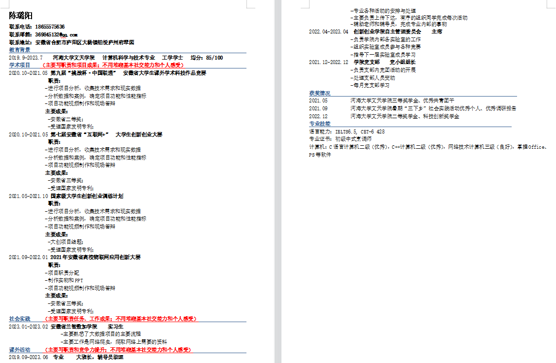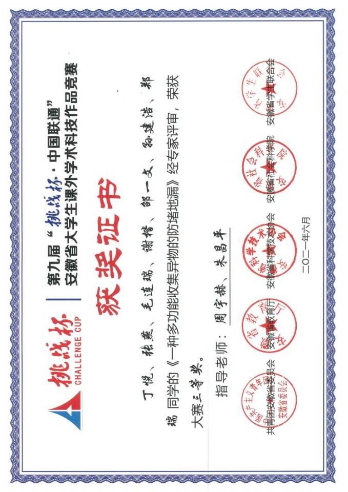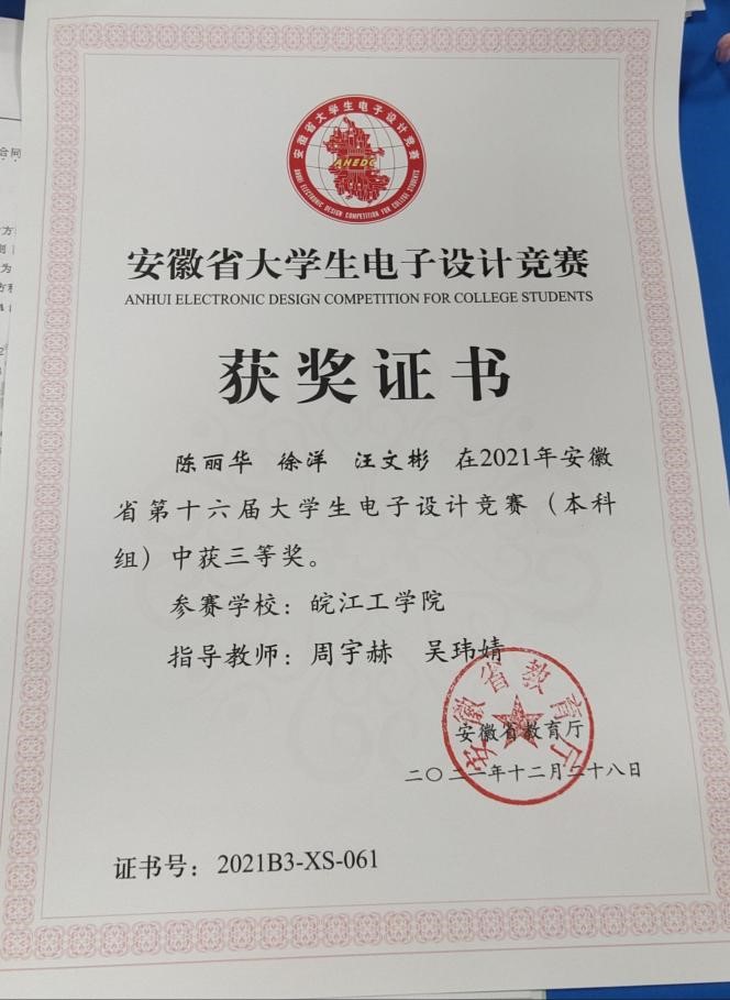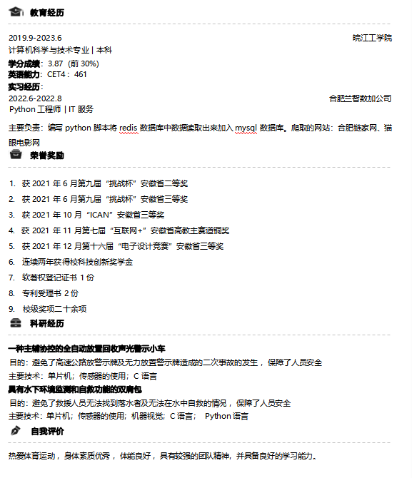 我是皖江工学院2019级新能源科学与工程徐志宇,高中毕业于桐城中学。在大二期间成功通过英语四级,同一学年成为一名中共预备党员,在大二暑假时期,我加入了机器人实验室,在实验室期间熟练掌握了51单片机的相关知识,也对机器人相关方面有了初步的了解,同时暑假期间在老师的帮助下我先后发表了两篇实用新型专利,其中一篇以第一发明人著作。并且大三上学期在实验室同学和老师的帮助下获得了两个国家A类赛事奖励——中国机器人大赛二等奖和三等奖。并且在大二和大三学年,共计获得两次国家励志奖学金,校级奖学金数项。同时大四期间获得了优秀毕业论文。目前正在家备考,争取二战上岸。凡是过往,皆为序章,感谢大学四年的经历,感谢老师及同学们的帮助,后会有期。