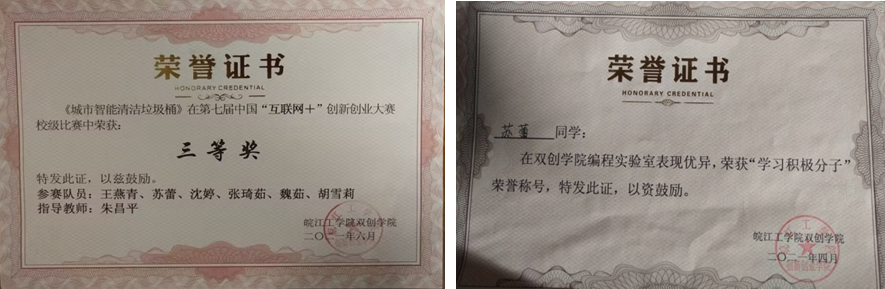 我是皖江工学院计科2023届毕业生张燕,高中毕业于合肥锦绣中学。大四下考研因为疫情影响,导致几分之差与目标院校失之交臂。我大学的创新实践导师一直评价我有做创新研究的天赋,因此决定继续参与学校导师团队的研究工作,并二战考研。衷心感谢大学期间学校和老师们心系学生发展,为学生特长发挥认真引导和支持。我自幼喜爱创新,进大学不久就加入了学校双创学院卓越实验室。实验室学习给予我很多课题研发机会,且能够在繁忙的工作学习中获得很多乐趣,感谢学校给我创造了非常好的学习和课题研发环境与平台,在整个课题研究与完成过程中我不仅在技术能力上有了显著的提高,更重要的是从学校双创学院博导名师导师团队多位老师身上学到了细致、踏实的工作作风,以及对学术领域严谨的态度和开阔的思维方式。这些都将是我今后工作发展的不竭的动力。在实验室期间获得省级学科赛事奖励4项,实验室对我的影响颇深。衷心感谢,并祝愿皖江工学院越来越好。