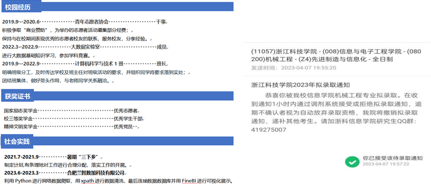 我是皖江工学院计算机科学与技术专业2023届陈丽华,我高中毕业于六安市第二中学河西校区。大四下考研成绩总分:311分(政56英74数85专96),过了国家线,但离学校的复试线差了43分,报考学校的导师和学长均感到遗憾,并欢迎我先参加他们的科研项目,早日接触课题,边备考边做研究,通过二战考研成为他们团队的正式成员。我能受到心仪学校的欢迎,源于我的工程实践经历。我大二上加入学校双创学院卓越实验室,在实验室中,学校拨专款立项资助我们实现创意,经过琢磨测试、完善优化,有2件实物作品制作成功,获得国家受理发明专利2件,获得挑战杯等学科赛事省级奖项5项,软著1件。是学校给予我们工程实践能力训练的良机,学以致用,从项目的完成过程中动手能力不断提高。感谢学校的培养、感谢导师全天候与我们一起泡在实验室,用带研究生的办法悉心指导我们做项目。