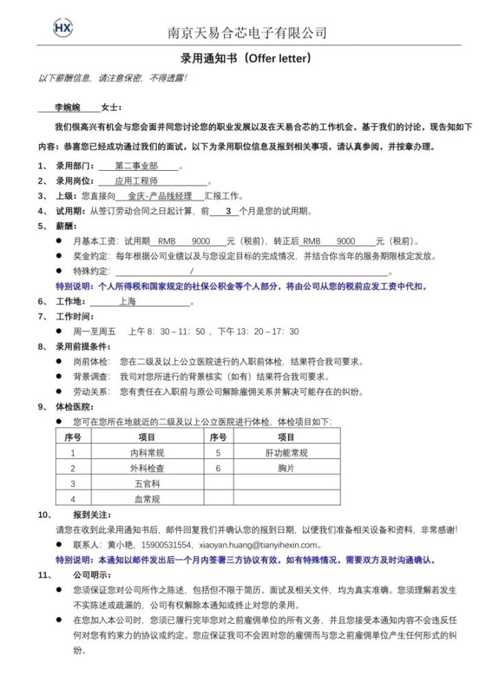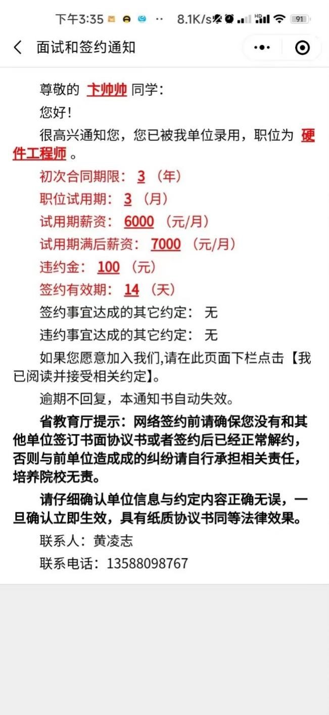 我是皖江工学院自动化2023届李婉婉,我高中毕业于亳州市第十八中学。大四下被南京天易合芯电子有限公司优录,转正月薪9K,试用期不打折仍是9K,在企业主要从事项目研发。我能被企业优录,得益于大学期间学校的精心培养以及参加了企业培训。我大一即加入学校双创学院卓越实验室,在实验室中,我和项目组同学自主完成大创项目2项,项目不仅做出了实物作品,还获得国家受理发明专利3件,获得互联网+等学科赛事省级及以上奖励2项,在SciencePG上发表论文一篇。感谢学校一直重视学生工程实践能力的培养,感谢老师。言传身教、兢兢业业。我将珍视大学的学习经历,铭记恩师教诲,爱岗敬业,在创新型国家的建设中发光发热。