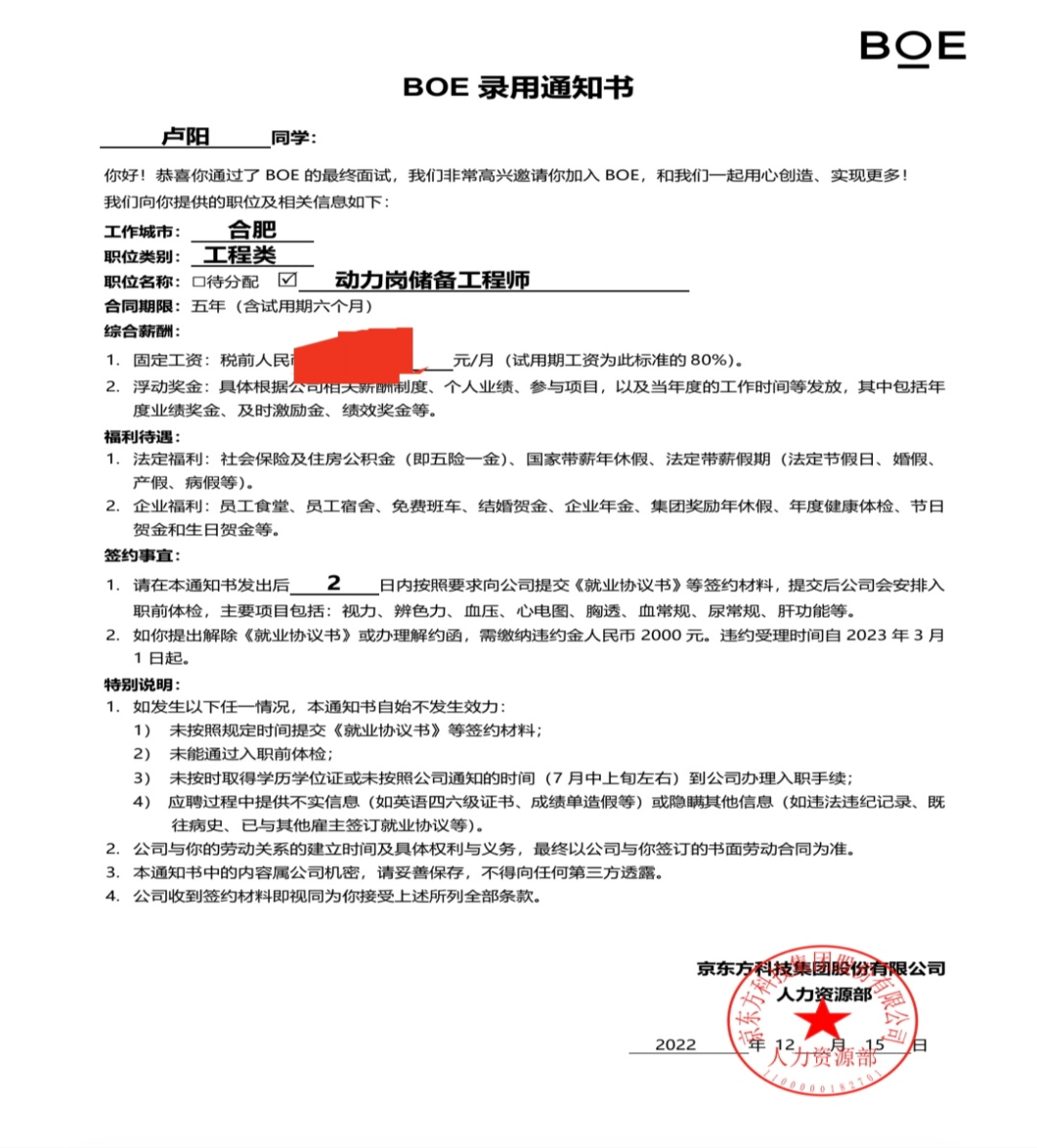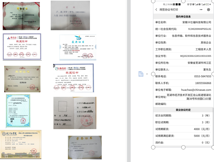 我是皖江工学院计科2023届毕业生卢润,高中毕业于蒙城二中。大四上就被安徽卡仕福公司优录,主要从事教学工作。包吃包住,去掉五险一金之后基础薪资5k,授课一天另发0.5k,到手月薪1万左右。早上8.30上班,下午5.30下班,每周双休。能拥有这份让人满意的工作,得益于大学期间学校的精心培育。我大一参加学校双创学院卓越实验室,在这里,我学习到了很多知识,并且在实验室老师、学姐与学长的帮助下将理论知识应用到实践中,获得多项证书,奖学金等。