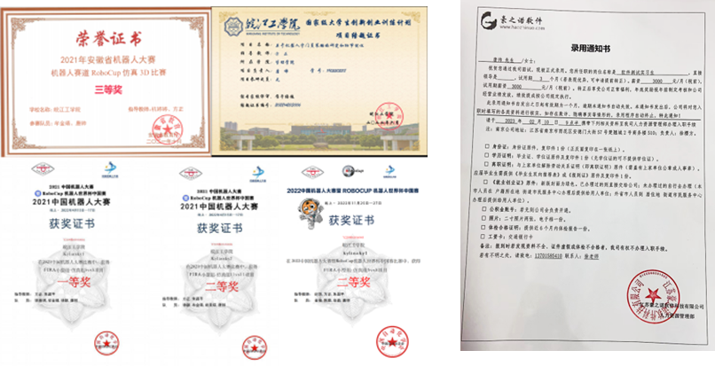 在实验室期间,积极学习参加各类项目。在2022年参加的中国机器人大赛中,fira5v5顺利打败上海电力大学等各类强队以第四名的成绩获得中国机器人大赛fira5v5赛项一等奖,并成为下一年的种子队。Fira11v11赛项在淘汰赛中遇到上届冠军西北工业大学,以国二的成绩结束比赛。