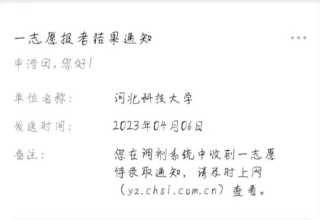 我是皖江工学院电气工程及其自动化2023届毕业生申浩田,我高中毕业于涉县第一中学。报考院校:河北科技大学。考研成绩总分309(政59 英44 数73 专133),成功被这所学校录取。我能如愿考取研究生,除了我个人有明确的目标、脚踏实地的学习、一步一个脚印的向前。还特别感谢学校的培养,我于大三下加入学校双创学院卓越实验室。在实验室老师引导我们制定协同完成毕业设计和复习考研的学习计划,指导我们做好时间管理,不和他人比较,持之以恒做好自己