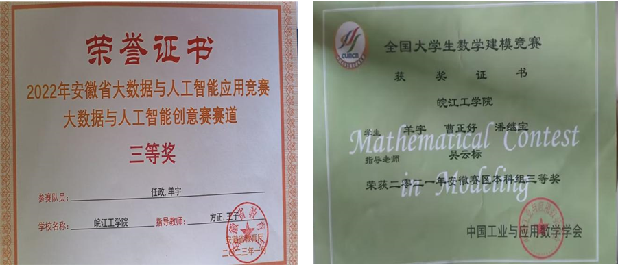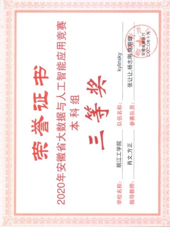 我是皖江工学院 2019 级计算机科学与技术的羊宇,我高中毕业于合肥市庐江县白山中学。我大二上学期即加入学校编程实验室,在实验室中,感受到了大家对创新与实践的热情,也感受到了指导老师对我们的悉心指导。在实验室期间获得校级奖项若干,参加过全国大学生数学建模大赛获得省级三等奖,安徽省大数据与人工智能应用竞赛获得三等奖。感谢学校提供的良好环境,感谢实验室指导老师的悉心培养,感谢授课老师的认真负责。祝愿我们的学校越来越好。