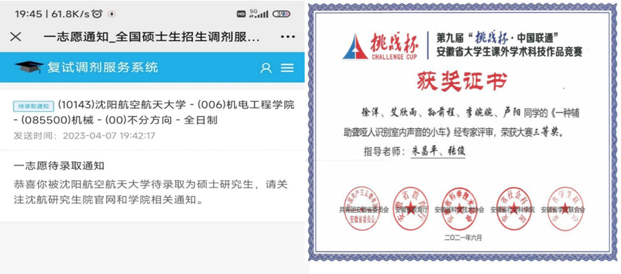 我是皖江工学院 2019 级车辆工程孙前程,我高中毕业于阜阳市临泉县第二中学。目前成功上岸沈阳航空航天大学。我能被沈航录取,得益于大学期间学校的精心培养以及自己的不懈努力。我大二即加入学校双创学院卓越实验室,在实验室中,我和项目组同学自主完成大创项目 1 项,项目不仅做出了实物作品,还获得国家受理发明专利 1 件,获得互联网+等学科赛事省级及以上奖励 3 项。感谢学校一直重视学生工程实践能力的培养,积极为学生不断改善学习条件。感谢老师的辛勤付出、悉心教诲。接下来我将铭记恩师教诲和“上善若水、笃学敦行”的校训,在研究生阶段继续努力学习,不负大学期间学校和老师的精心培养。