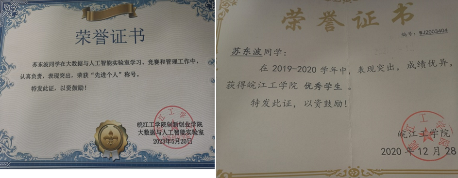 我是皖江工学院2019级通信工程专业苏东波,我高中毕业于滁州市定远县第三中学,目前在南京一家公司,做嵌入式工程师,薪资待遇9K*14薪。大学四年期间我加入了大数据与人工智能实验室,在这里我学到了很多东西,感谢实验室提供给我们良好的学习平台,让我能够与实验室其他优秀的同学认识,互帮互助,共同进步。在校期间我获得过两次“二等奖学金”,一次“优秀学生”称号,通过了计算机二级,英语四级,这要得益于实验室提供的良好的学习平台。最后,感谢各位老师对我的帮助和教导,在这里祝愿母校越来越好。