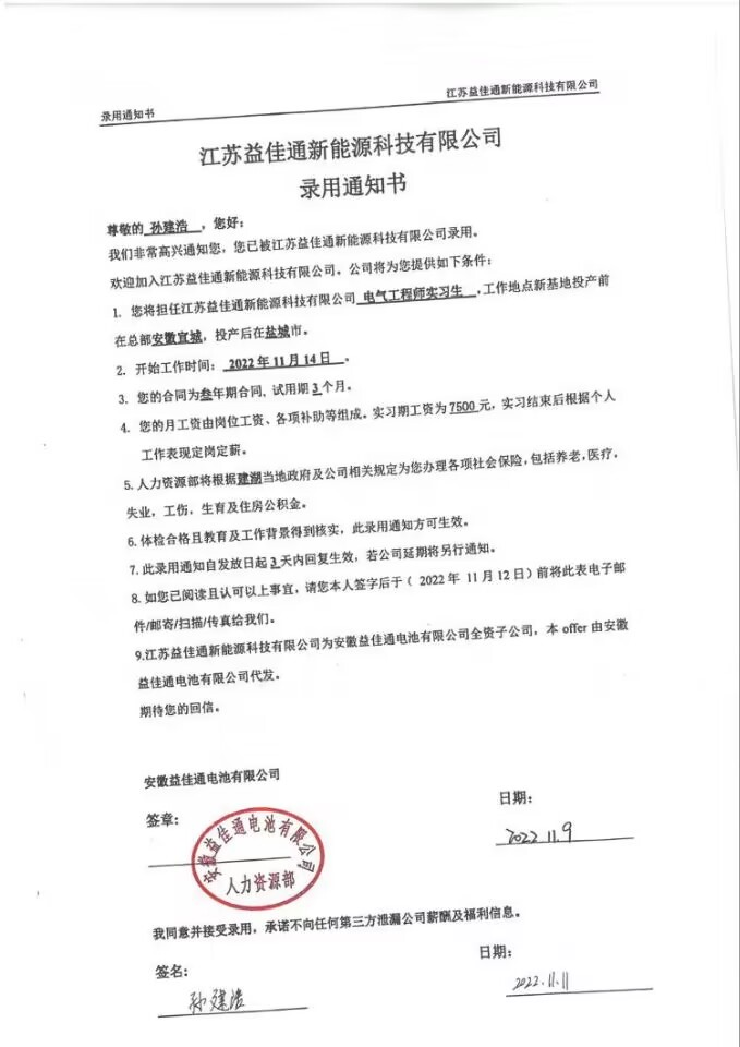 我是皖江工学院自动化2023届孙建浩,我高中毕业于临泉二中。大四上就被江苏益佳通优录,包吃包住,基本生活开销公司全包,另外实习月薪7.5K+,转正8 K+,在企业主要从事项目研发。我能被企业优录,得益于大学期间学校的精心培养。我们学校为学生实践创新创建了良好的条件,所有热爱创新实践的同学均能加入双创学院。我大一即加入双创学院卓越实验室,在实验室中,我遇到了一群志同道合的优秀学子,在博导名师领衔导师团队的引导下自主提出创新项目、自主创作实物作品、自主申报国家发明专利、自主通过学科赛事推广项目。我大学期间共完成大创项目5项,获得国家受理发明专利3件,获得互联网+等学科赛事省级及以上奖励9项。由衷感谢学校为我们提供了优质教学条件,感谢学校老师们认真授课,感谢双创学院导师们全天候陪伴引导我们实践。我将永远珍视这段美好的经历,潜心建设国家,用实际行动回报母校的培养。