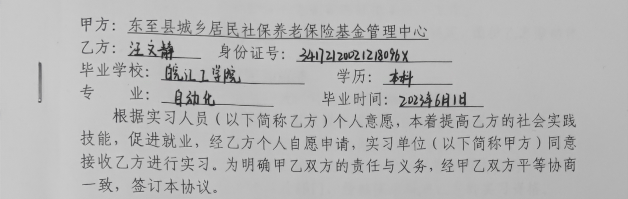 我是皖江工学院自动化2023届汪文静,我高中毕业于东至县第一中学。大四下学期进入东至县人社局实习,在事业单位从事材料初审以及文稿撰写的工作。一边上班一边备考公务员。之所以能够顺利的进入事业单位实习,主要得益于大学期间学校的锻炼以及培养。我大一下学期即加入学校双创学院卓越实验室,在实验室的精心培养下,成功在SciencePG上发表论文一篇,并且与项目组同学自主完成创新项目3项,其中一项荣获省级三等奖。在学习之余,我还多次参加志愿服务活动,并多次获得“先进个人”的称号。在实验室的学习过程中,不仅使我的创新能力有了极大的提高,也大大地拓宽了我的眼界,让我深刻的意识到需要不断地充实自己。由衷感谢皖江工学院提供的良好学习环境。涓涓师恩,铭记于心,感谢学校和各位老师的悉心栽培。我在未来的工作和生活中将永怀赤子之心,始终努力向上。