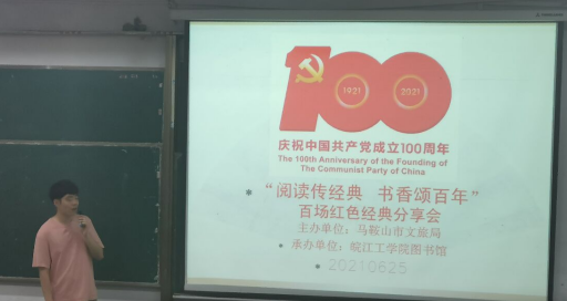 6月25日,由马鞍山市文旅局主办的“阅读传经典·书香颂百年”百场红色经典分享会皖江工学院分会场两场活动,由皖江工学院图书馆承办,先后于霍里山校区举行。200多位同学参加分享与讨论。中共皖江工学院纪委副书记、校思政部主任刘双同志等到场指导。电信院陈璐阳、章新辰等同学分别主持分享会。胡江颖、汤伟、张燕、谢飞等多位同学分别报告了近期所读红色经典图书或文章,分享阅读感悟。与会同学由此将更易于对延安精神、雷锋精神等宝贵精神的深入理解,进而有助于学习百年党史,以及中国共产党在百年光辉历程中所铸就的精神谱系,从而对全体学生知史爱党、知史爱国产生积极影响。校思政部和中共皖江工学院机关总支委员会给与前期读物推介、阅读及会场筹备指导。