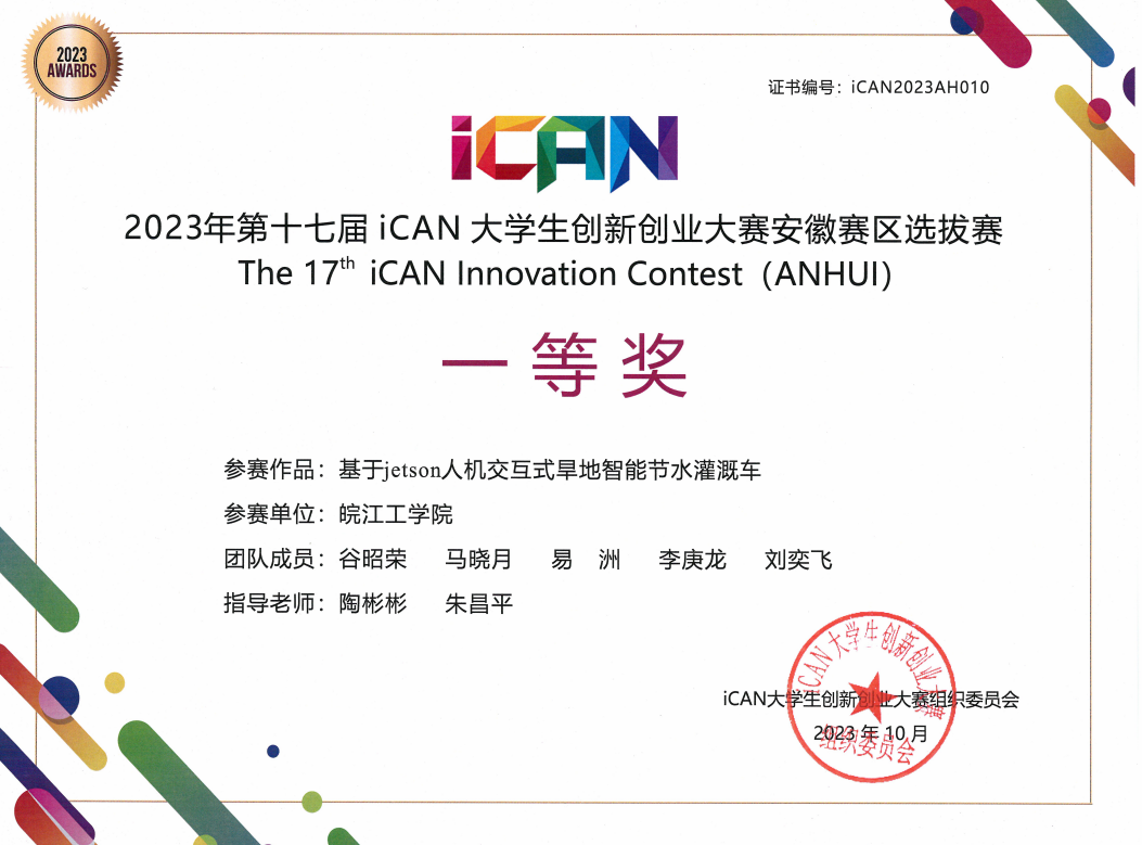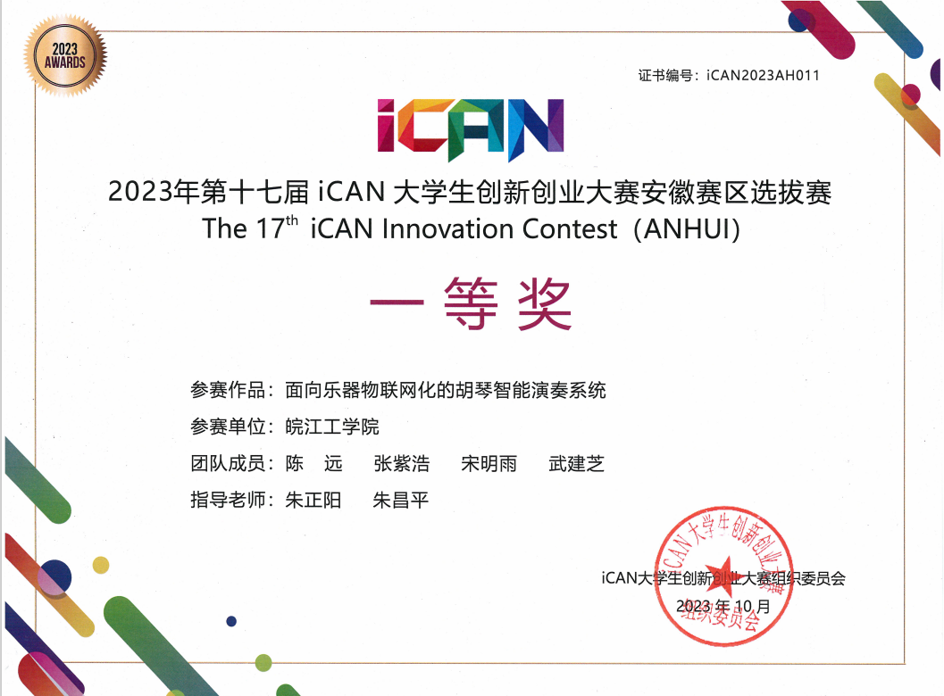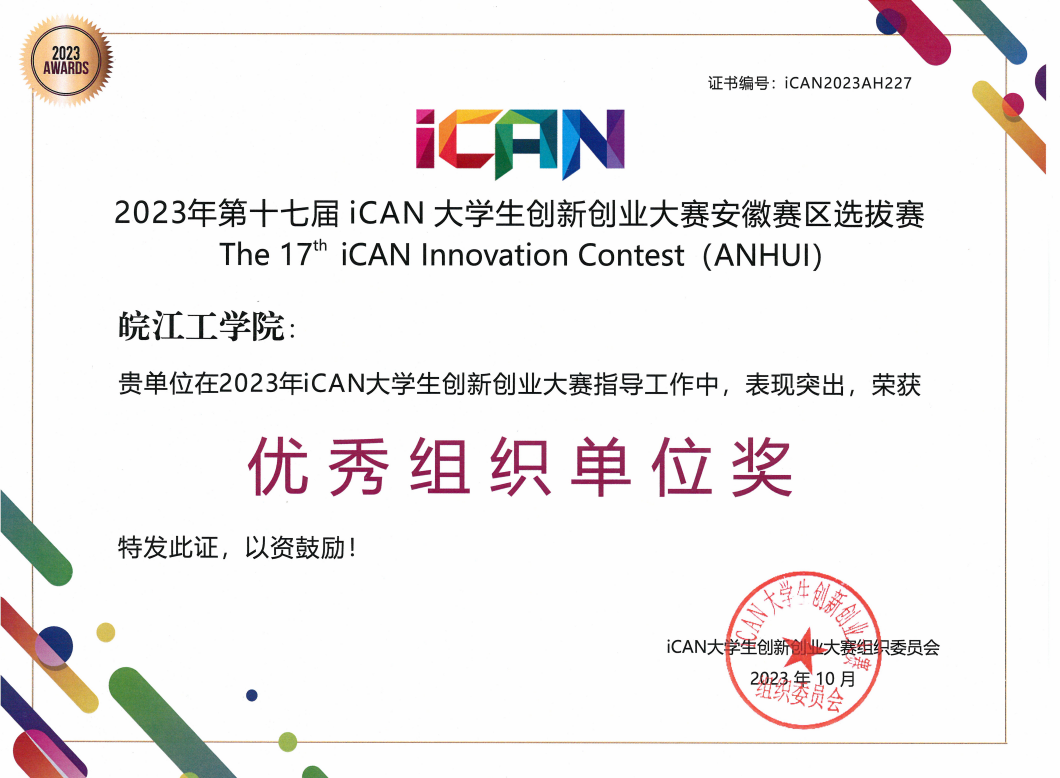 2023年3月22日,中国高等教育学会公布了教育部认可度最高的84项高校学科赛事,iCAN大学生创新创业大赛排序54,我校一直积极参加iCAN国际创新创业教育联盟的各项活动。2023年有60支队伍、300多名同学报名参赛,经过学校选拔赛,有25支队伍、近150名同学入围第十七届iCAN大学生创新创业大赛安徽赛区选拔赛决赛,我校在省决赛中荣获一等奖3项、二等奖8项、三等奖14项。3支队伍将于2023年12月赴北京奥林匹克塔参加全国总决赛,我校陶彬彬、朱正阳、张鹏、杨雅师、朱昌平五位老师荣获优秀指导教师奖,我校荣获优秀组织单位奖。