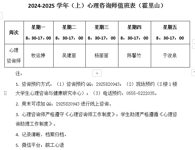 1.按照心理咨询专业规定,每人每次咨询时间约50分钟。请至少提前一天预约(紧急情况除外),接受预约的来访者须准时到达心理咨询室,如有特殊情况无法按时赴约,请提前半天告知。