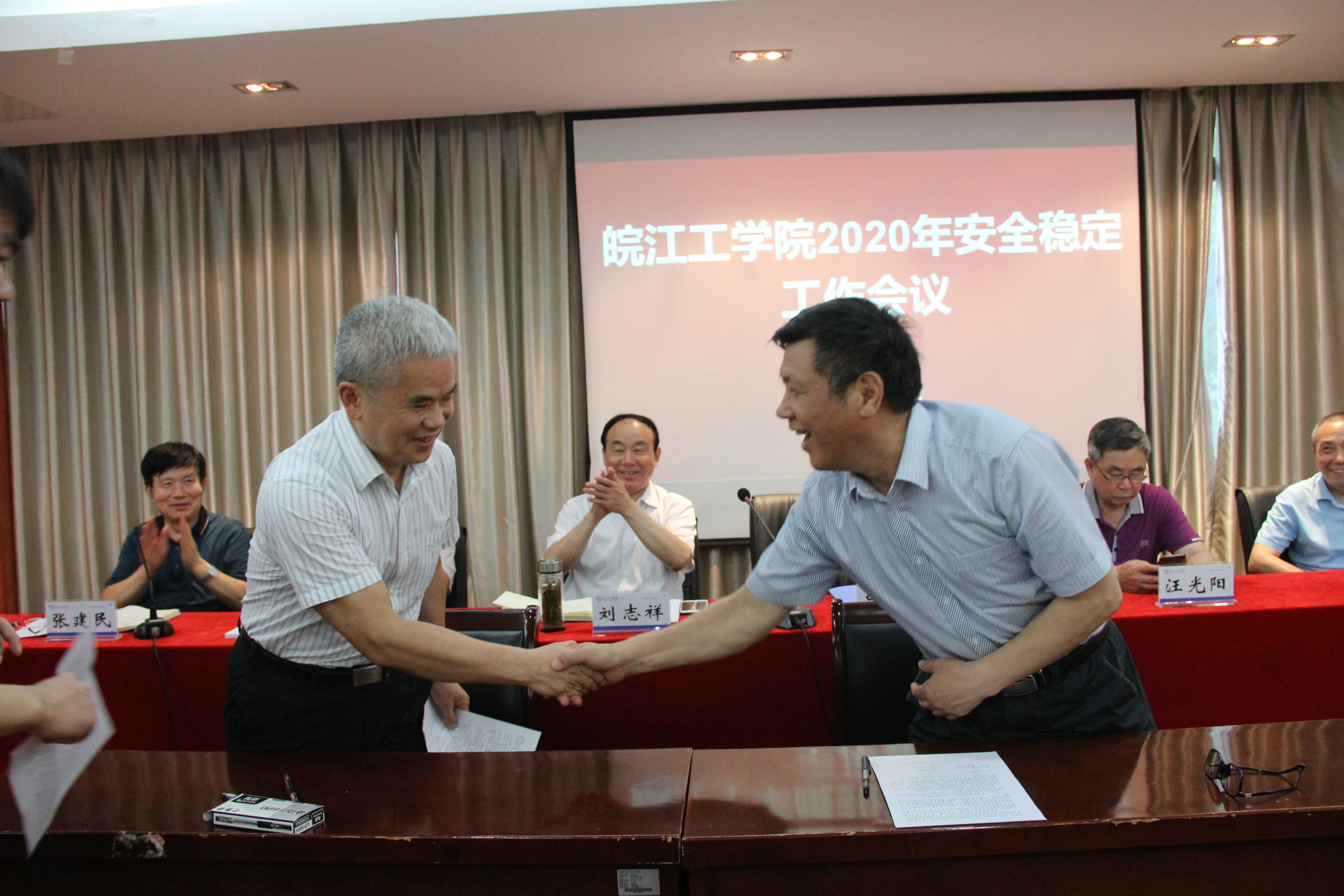 会上,吴继敏校长代表学校与各学院、各部门党政主要负责同志签订了《皖江工学院2020年安全稳定包保责任书》。张建民副校长介绍了《皖江工学院2020年安全工作要点》就传达贯彻本次会议精神,落实好今年安全稳定工作任务提出了要求。(院务部 供稿)