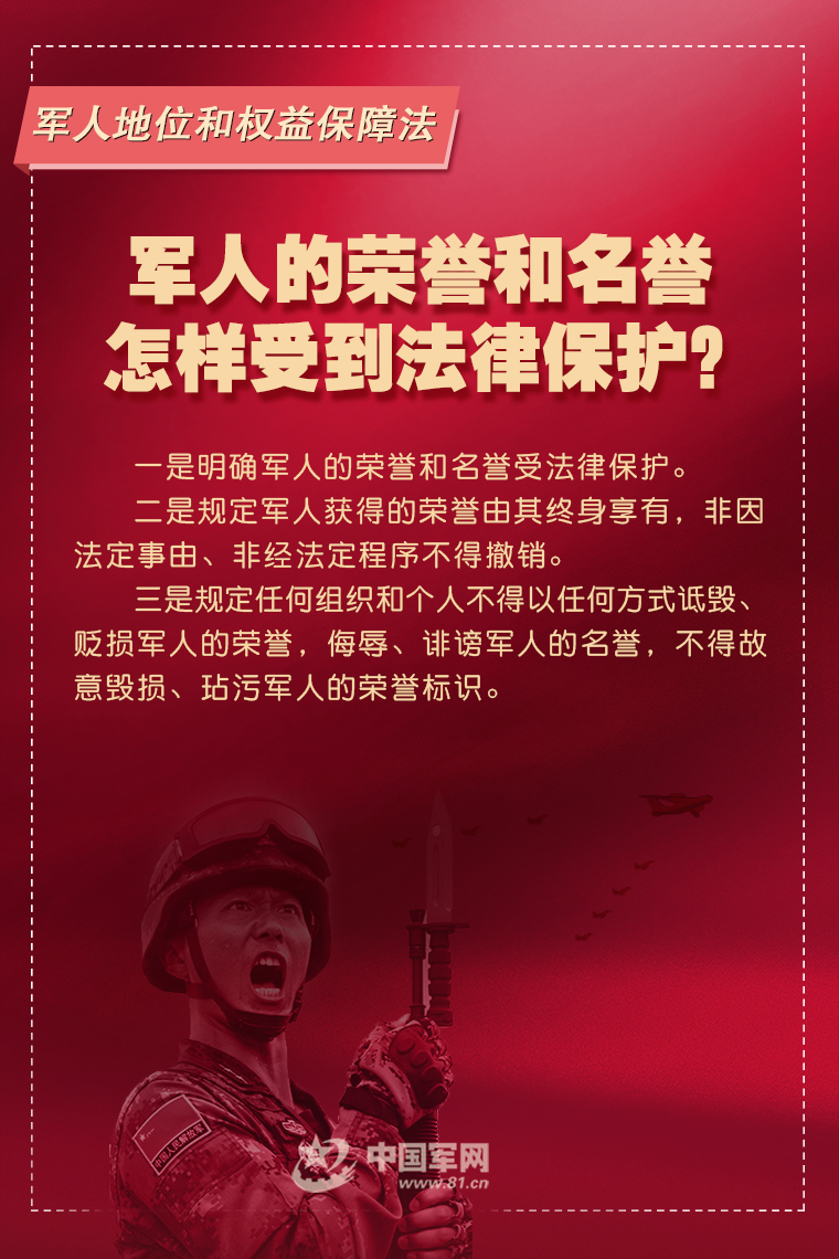 6月10日,十三届全国人大常委会第二十九次会议表决通过《中华人民共和国军人地位和权益保障法》,国家主席习近平签署第八十六号主席令予以公布,自2021年8月1日起施行。这是军人地位和权益保障的基础性、综合性法律,是深化国防和军队改革的重要成果。这部法围绕军人地位和权益保障的基本原则和基本制度作出了哪些规范?中国军网推出专家系列解读,阐释重要规定内涵和深层考量,快来一起看看吧。