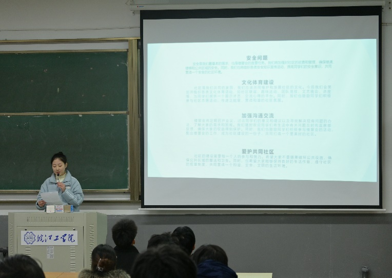 王晨同学作为主席团代表发言,强调了楼管会今后的工作中需要注意的几点问题:保证宿舍安全、建设社区文化、加强楼栋间沟通交流、爱护共同学生社区。并表示在今后的工作中她将全力以赴,为大家提供更好的服务。希望全体楼管会成员们可以共同努力,建设一个温馨、和谐的学生社区。 据悉,因楼管会实际工作需要,楼管会划分了五个职能部门,分别是办公室,监察部,文体部,外联部和宣传部,并由各部长向大家介绍各部门的职责以及工作内容,随后进行了各部门新进人员面试。