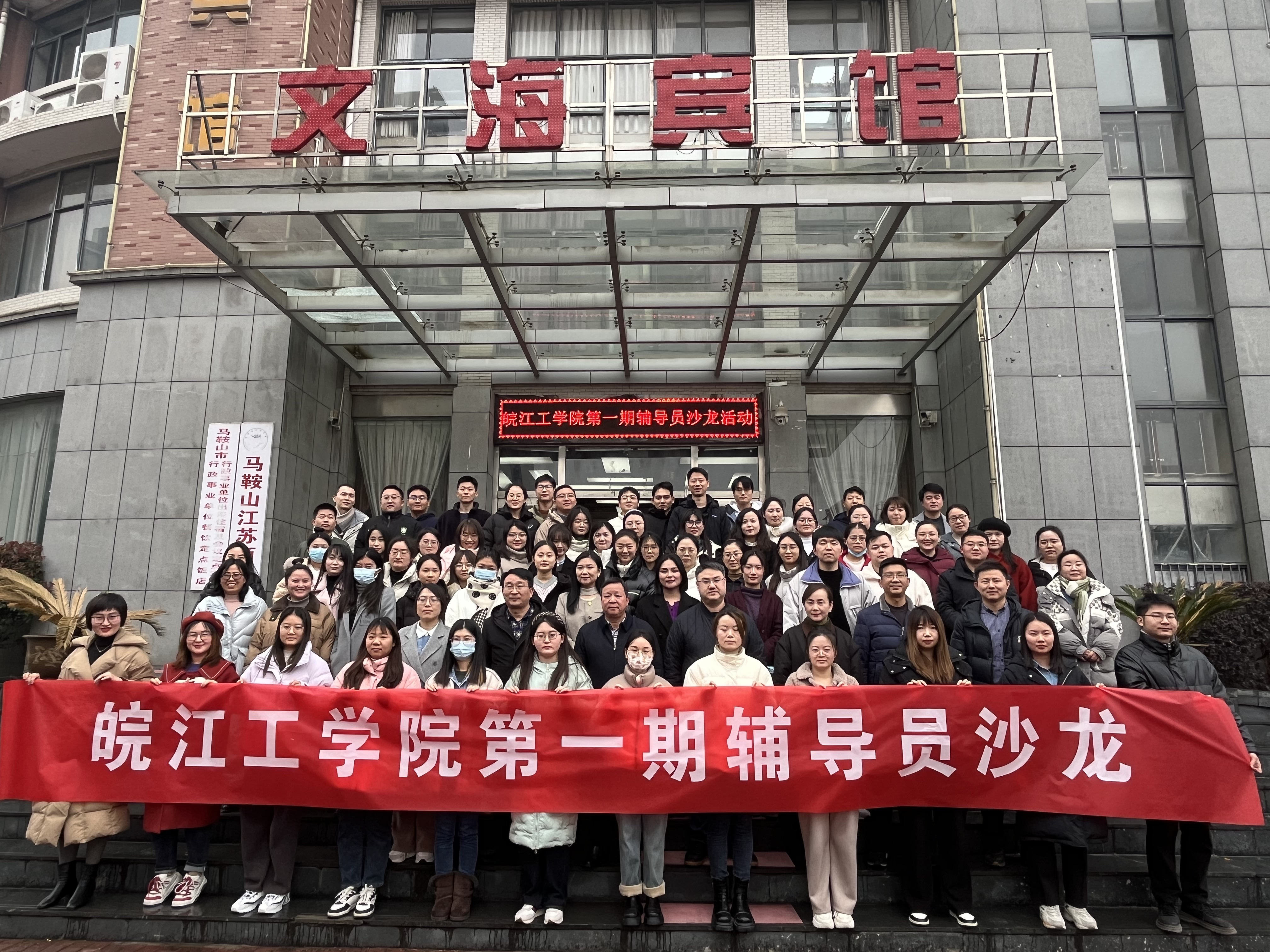 会议为参加本届班会大赛获奖的11名辅导员老师和两个优秀集体颁奖,颁奖典礼结束后,全体学工人移步至文海宾馆门口合影留念。