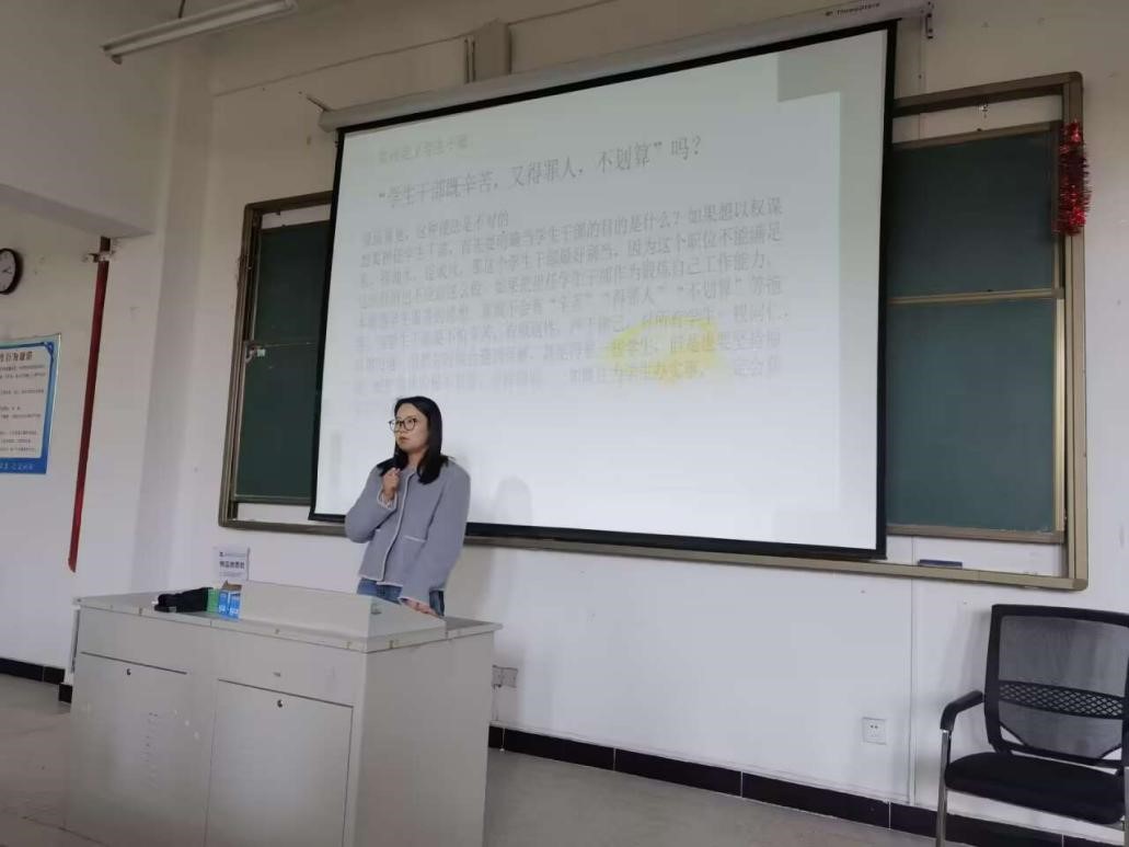 首先,谢清雅老师致辞,对我们学生干部提出八点要求。要胸怀大志;明辨是非;学会独立思考;严于律己;谦卑认真;具备强号召力;发挥特长,发挥班级带头核心作用;要有全局观念。通过细致的八点要求,督促学生干部完善自身,更好为同学服务、为班级服务。随后,财经学院辅导员王慧慧老师从如何定义学生干部、学生干部应该具备的素质和能力、学生干部的团队管理、如何做一名优秀的学生干部这四个方面指导学生干部的发展方向。围绕“学生干部既辛苦又得罪人”这一伪命题讨论担任学生干部的初心和思想。随后提出担任一名合格的学生干部应该具备思想政治素质、业务素质、能力素质、集体素质等能力素养。最后针对当前学生干部团队所出现的缺乏沟通、职责不均、服务态度消极、职责理解片面等问题分析出当前干部群体共同目标不明确、害怕出现冲突、团队缺乏信任等原因,为进一步打造一支高效的学生干部团队指明了方向。