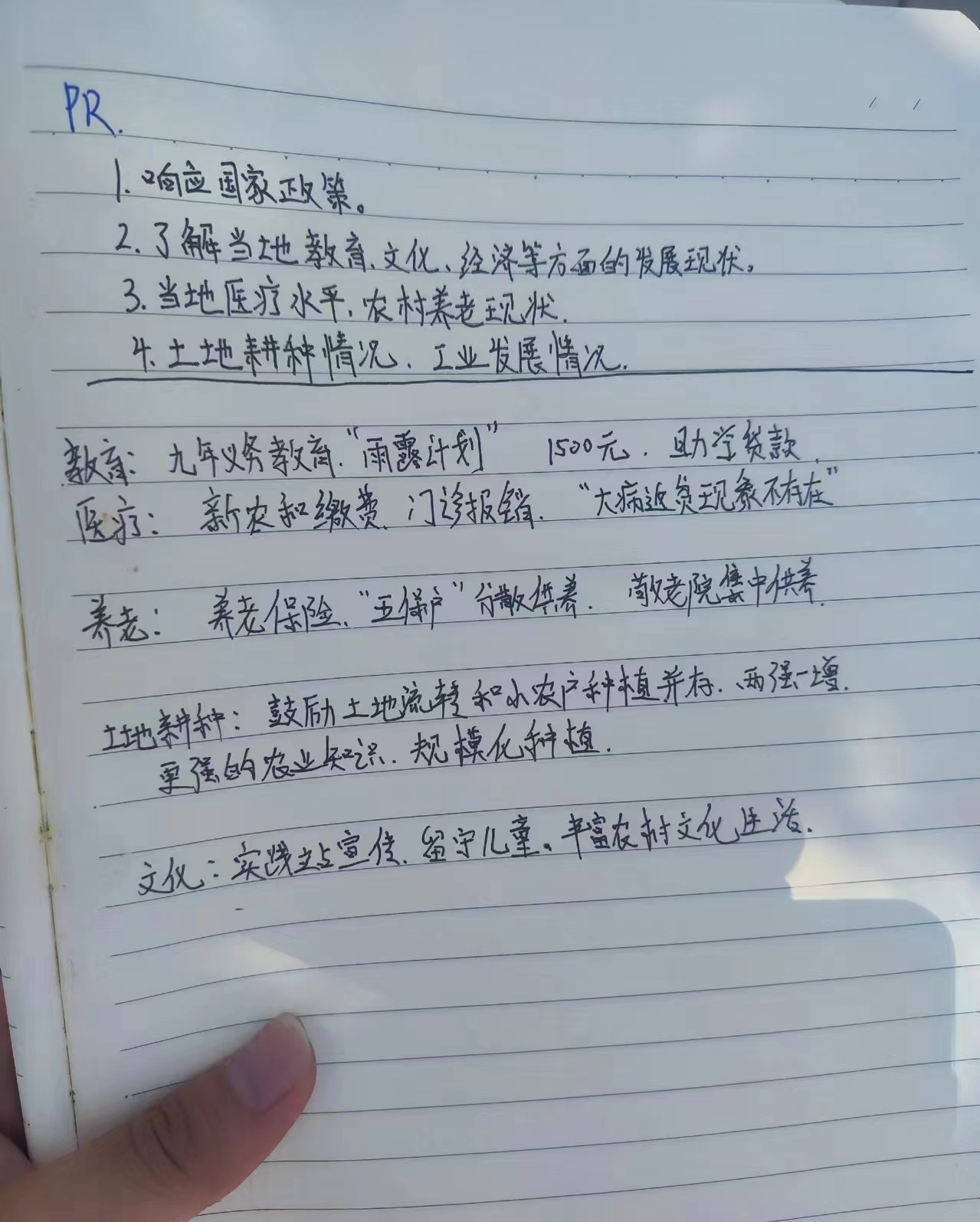 初到乡村,实践队成员便与村书记助理开展了一次座谈交流。在座谈会上,实践队了解到很多有利于乡村发展的政策。在教育方面:乡村儿童基本参加九年义务教育,并开展了“雨露计划”和助学贷款等方面利于乡村发展的积极政策。在医疗方面:有新农和缴费、门诊报销,“大病近贫现象基本不存在”等等。在养老方面:有养老保险、“五保户”、分散供养以及养老院集中供养。