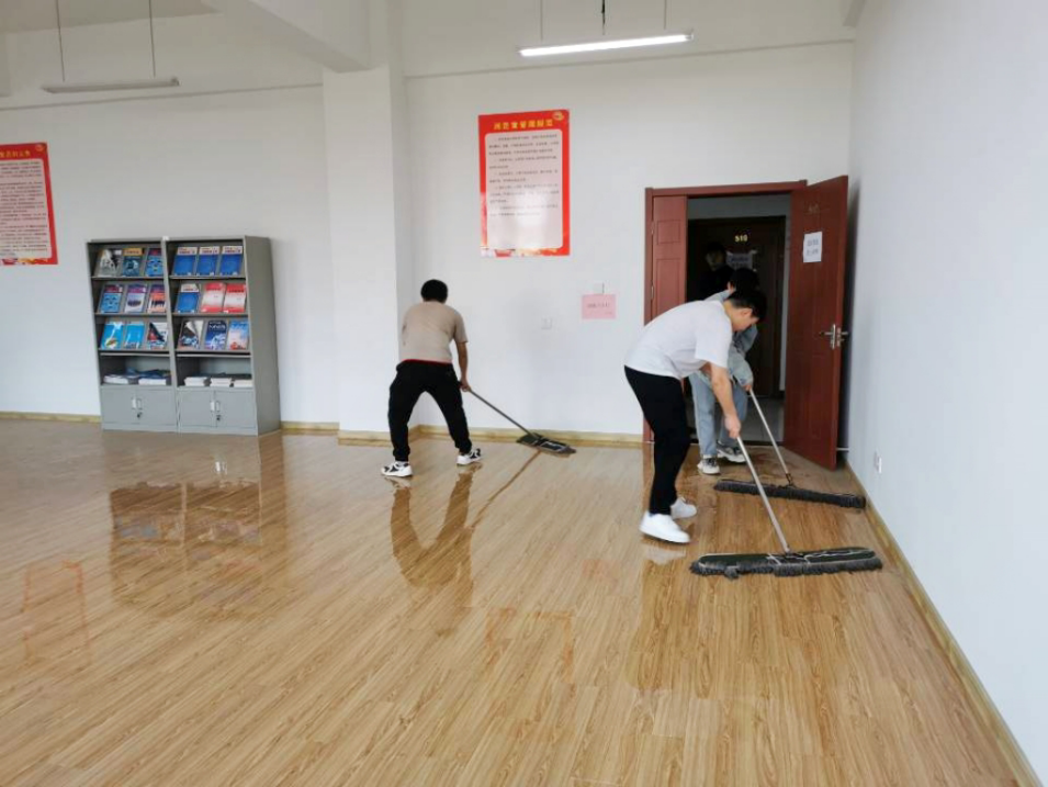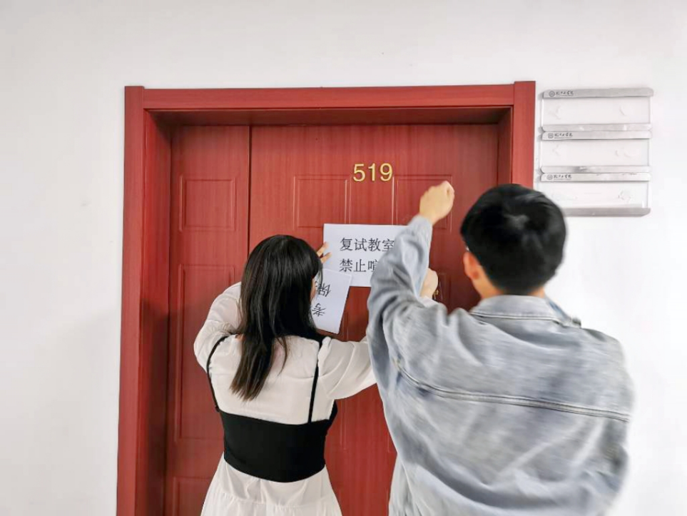 经过简单的动员后,学生会部长级们就带着满腔的热情分别来到了H512、H519、H523、H525、H529、H533这六个教室,全力进行打扫卫生,让同学们有个整洁的复试环境。接着,他们整齐地摆放桌椅,张贴保持安静的标语、学院的院旗以及党旗。构思巧妙、布置精心,教室的每个角落都被他们赋予了特殊的意义。最后,一间间敞亮的复试教室在晚霞的照应下应运而生。