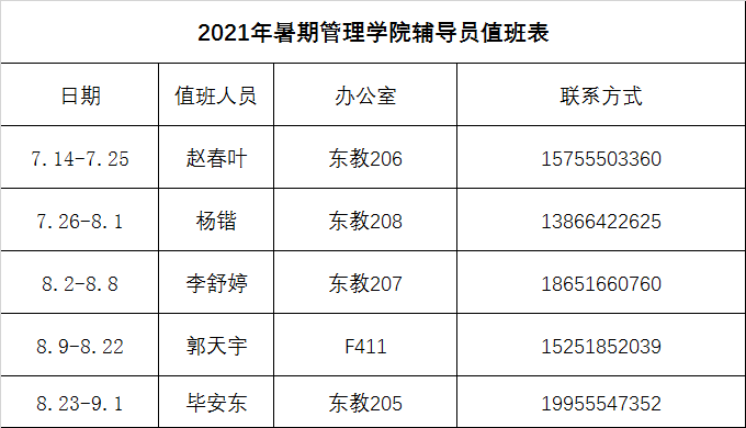 2021管理学院暑期留校值班表
