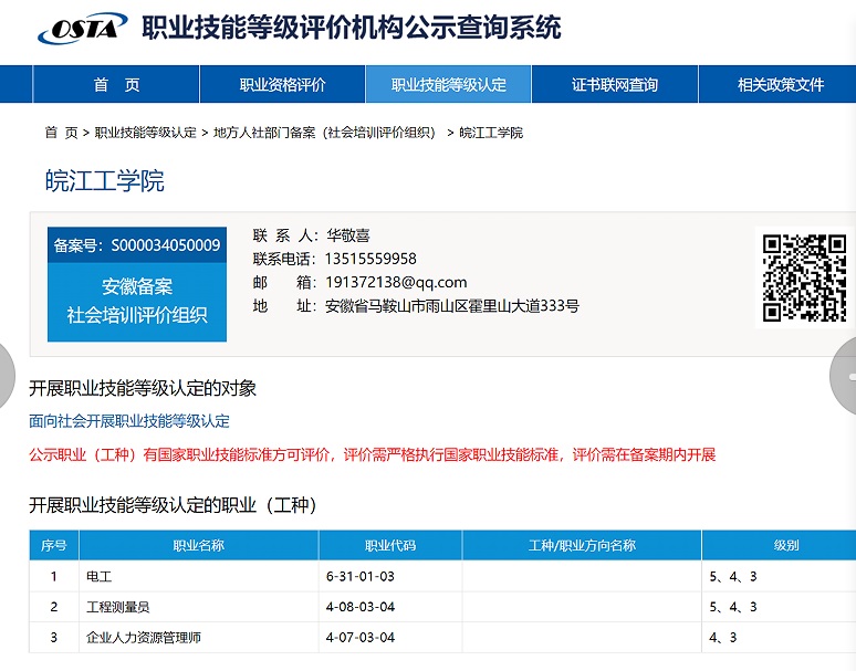 经马鞍山市人社局专家组现场评定、省人社厅审批、人社部备案,认定我校具备社会培训评价组织职业技能等级认定条件。我校现已具备电工、企业人力资源管理师、工程测量员三个工种职业技能等级认定职业(工种)的认定资格。据悉,我校是马鞍山市第一所可以开展职业技能等级认定的本科高校。