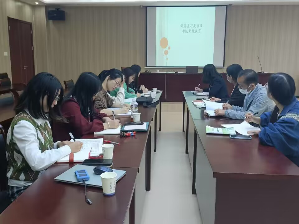 在备课会中,赵萍就德法实践课安排、考试考风考纪及主观题出题等内容进行阐述。他表示,根据教务部合格评估档案检查的反馈情况,电子实践课报告调整为实践本子,以手写纸质版为主;同时,他强调考试考风考纪问题,任课教师要及时提醒学生认真复习备考,查收考试通知。最后,提到主观题组卷出题,要紧密联系教材,秉承“理论联系实际”的原则。