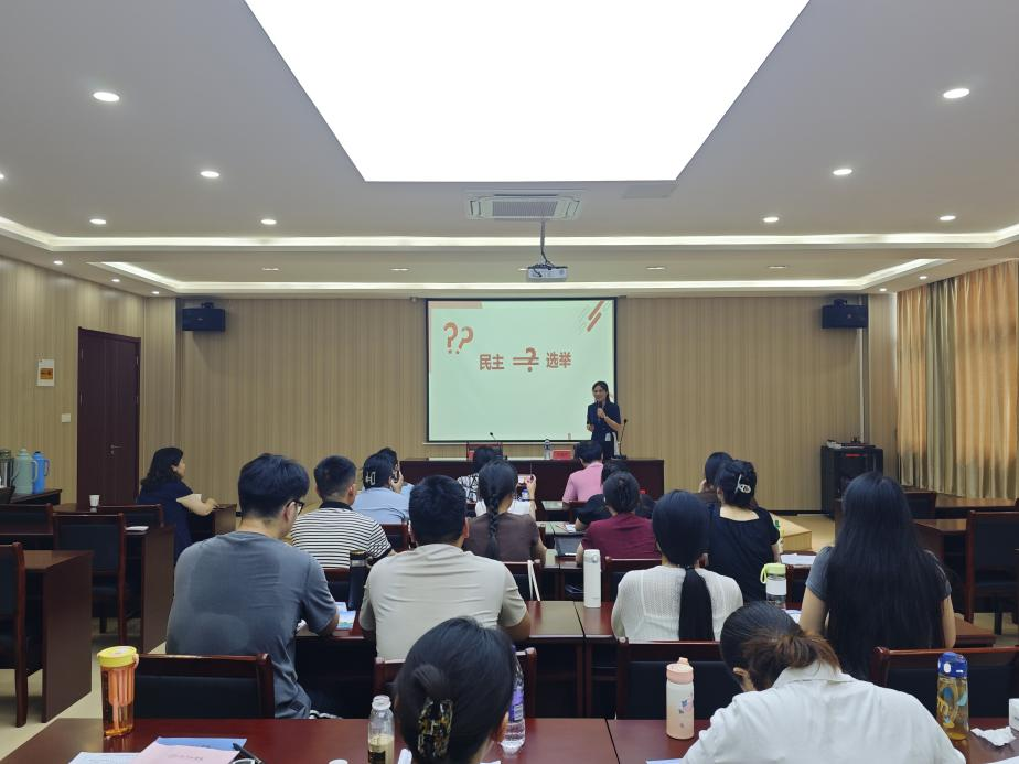 王亚萍以《什么是全过程人民民主》为全体思政课教师做了一场观摩教学示范课。王老师通过流畅的导入环节和精彩的设计教学,通过循序渐进的方式将全过程人民民主的本质属性生动诠释,展现出了全国思政课大赛特等奖选手的扎实教学功底和高超教学水平。同时,他分享磨课备课经验和参赛的心路历程,就如何呈现一堂有厚度、有亮点的思政课进行分享。他提到,比赛要抱着勇者无畏的心态去参加,平时要多积累,扎实理论功底,注重每一次的参赛环节,将专题教学设计和课件排版制作充分结合;而在课堂中,提前做好学情分析,注重提高学生的内驱力,找到学生认知的堵点。