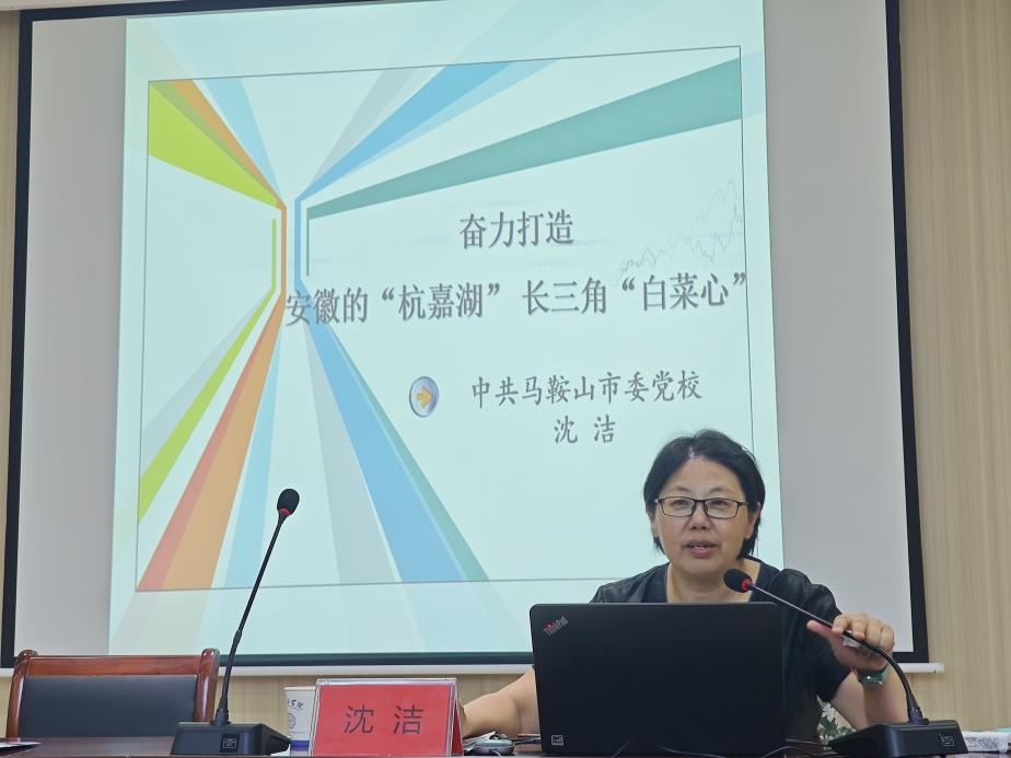 沈洁以《奋力打造安徽的“杭嘉湖”,长三角的“白菜心”》为题,分享马鞍山市总体规划和城市定位,分别从产业转型、城乡融合、社会治理和生态环保等方面详细阐述。当天,她还以《如何写好资政报告》为题,为全院教师做了资政报告撰写能力培养讲座。讲座中,就资政报告的行文步骤、研究方向及选题来源作出详细的讲解。她强调,资政报告是立足国情、社情、民情,围绕热会热点话题进行撰写,要把握时机,选题准确,深入调研把握实际情况,具有前瞻性和针对性。