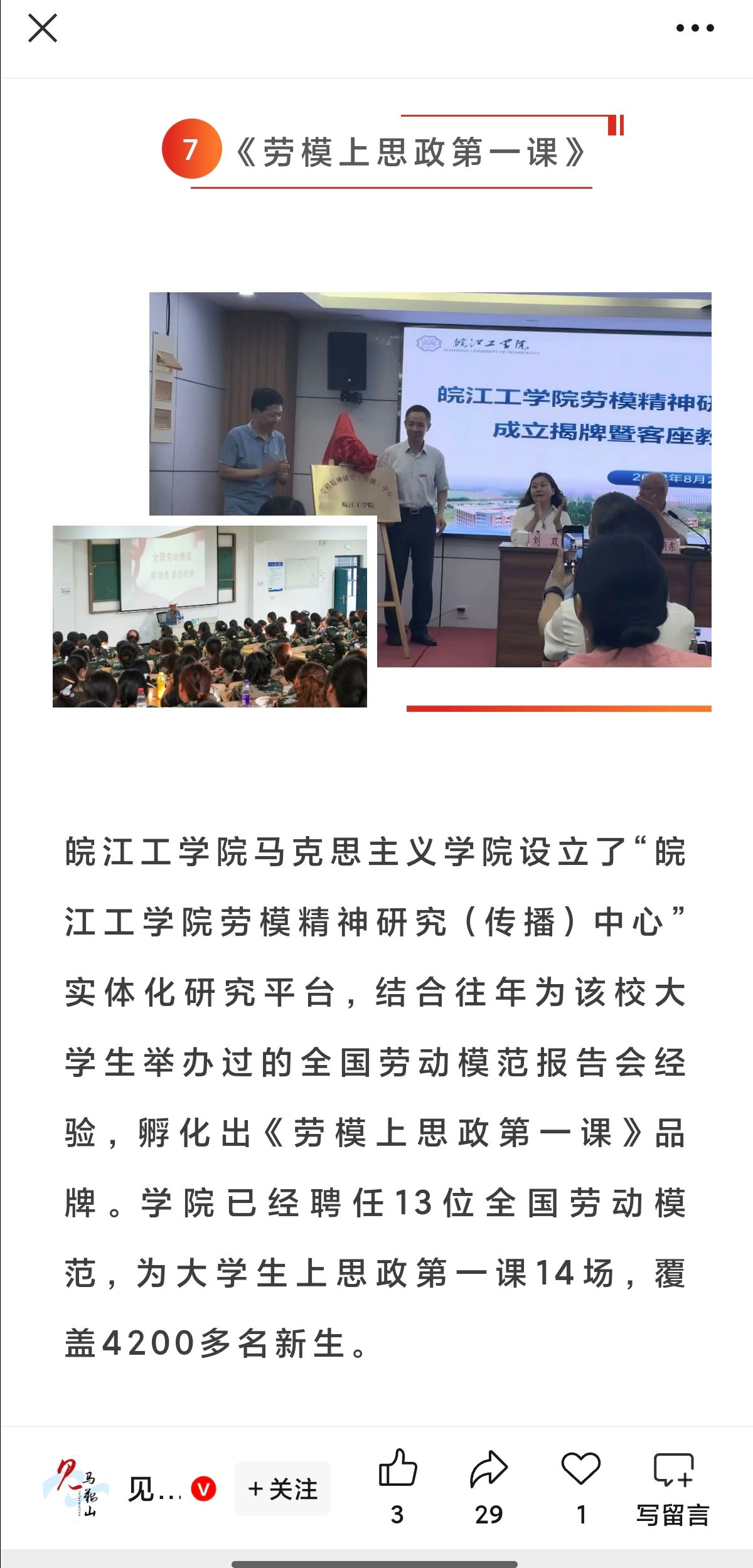 《见马鞍山》官方公众号报道我校“劳模上思政第一课”列为首批思政教育特色品牌