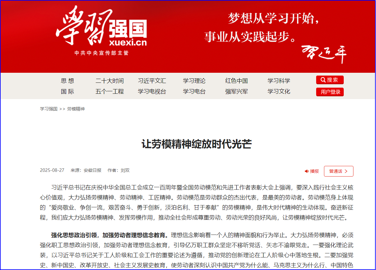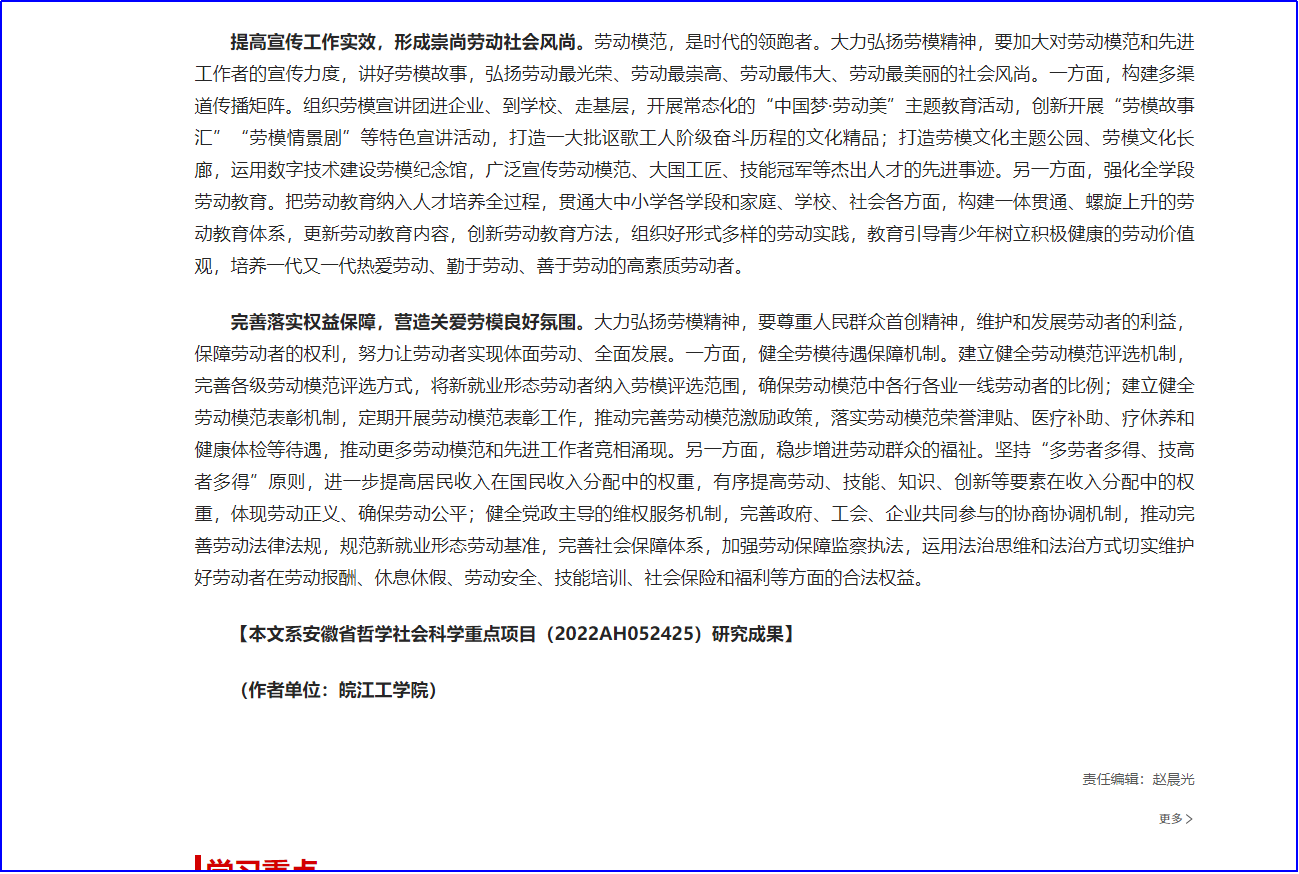 近日,我校马克思主义学院刘双撰写的题为《让劳模精神绽放时代光芒》的理论文章在“学习强国”国家平台发表。文章是在学习研究习近平总书记关于劳模精神的系列论述的基础上,深度研究国家关于劳模工作制度政策,并结合马鞍山市劳模(工匠)精神研究传播中心建设工作经验,进行的理论思考研究,也是中心建设的理论研究成果之一。