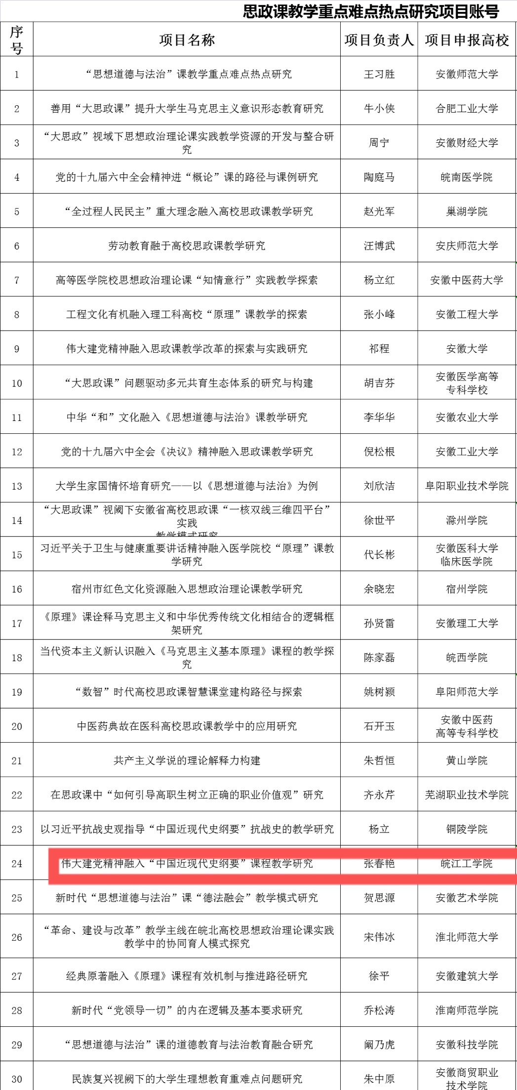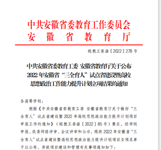 2022年6月,中安徽省委教育工作委员会、安徽省教育厅下发了《关于公布2022年安徽省“三全育人”试点省建设暨高校思想政治工作能力提升项目立项名单的通知》(皖教工委函[2022]278号)文件,经高校申报、专家组会评、评委会评审和公示,马克思主义学院教研室主任张春艳副教授获批全省“三全育人”项目,项目名称为《伟大建党精神融入“中国近现代史纲要”课程教学研究》。