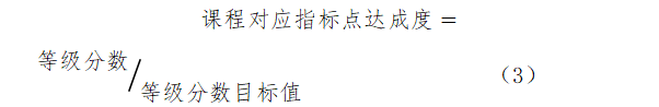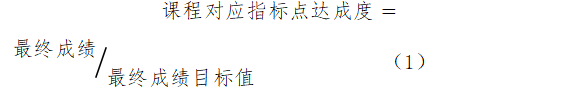 式中,最终成绩—取评价课程学生总成绩的平均值,如果课程对应多项毕业要求指标点,默认各指标点达成度相同;最终成绩目标值—100分;指标点对应的试卷分数—取评价课程各指标点对应试题的部分均值;指标点对应的试卷目标值—100分;比重—试卷成绩占总成绩的百分比;平时成绩目标值—总成绩中,平时成绩总分值;等级成绩—优、良、中、及格、不及格5个等级成绩,对应数字成绩分别为90分、80分、70分、60分、50分;等级成绩目标值—100分。