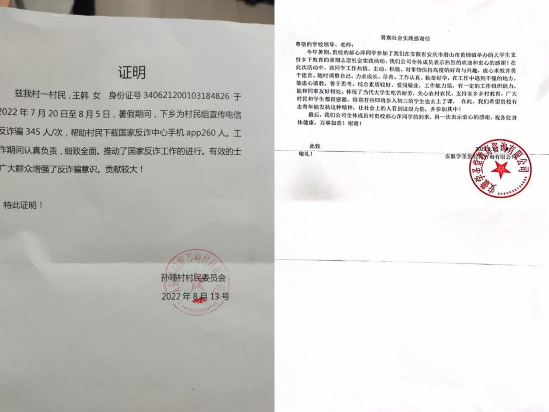 王韩同学在暑假期间下乡为村民组宣传反诈骗345人次,帮助村民下载国家反诈中心app260次。当地居委会致信赞扬其“工作期间认真负责,细致全面,推进了国家反诈工作的进行,有效的使广大群众增强了反诈骗意识,贡献较大!”。