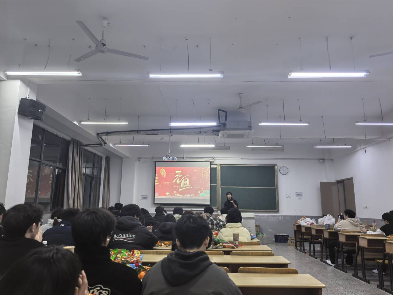 晚会伊始,辅导员姚慈航与班主任李锦景、陈颖钦依次登台致辞。老师们的话语饱含欣慰与期许,既充分肯定了同学们在过去一年里在学业探索、班级建设、同窗相处中的成长与进步,也为大家送上了真挚的新年祝福,勉励全体同学在新的一年里坚守初心、勇敢追梦,以昂扬姿态不负韶华、不负时光。与此同时,教室桌案上早已摆满精心筹备的饮品与零食——香甜的奶茶、清甜的砂糖橘、精致的小蛋糕,还有各班用心准备的特色小食,让同学们在味蕾的满足中,真切感受到专业大家庭的温暖与关怀。