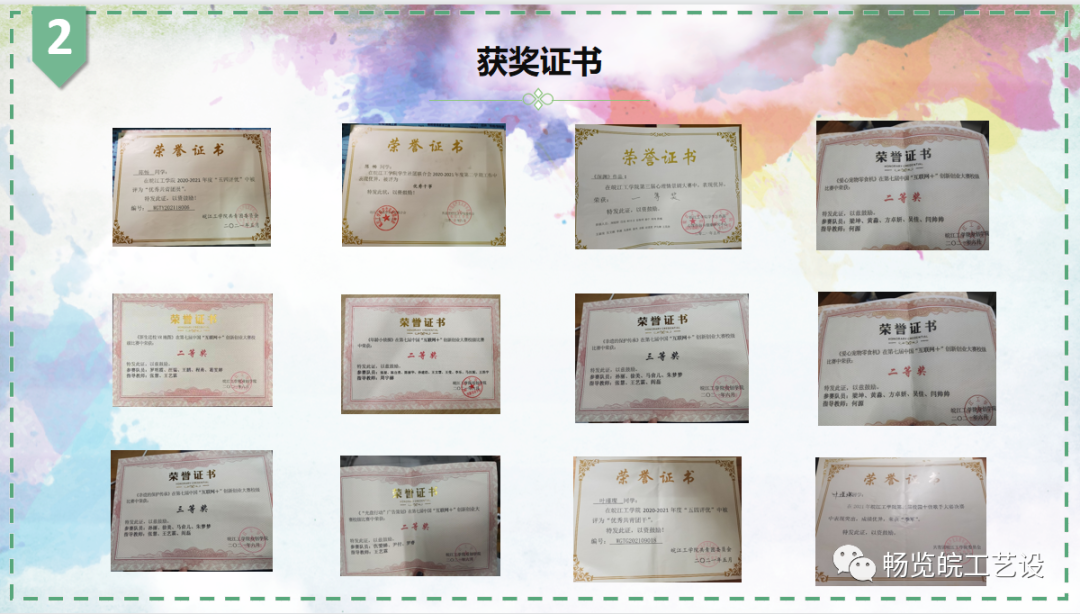 在优良学风的熏陶下,该班同学更是不断突破自我,赢得了无数荣誉。董欣驰获得“2021年全国大学生英语竞赛一等奖”证书、首届“外教社,词达人杯”全国大学生词汇能力大赛安徽赛区本科组特等奖、皖江工学院天勤杯英语竞赛二等奖等多项荣誉;吴佳获得“青苗杯.中建智立方”安徽省项目资本群英会荣誉证书;刘竞轩等4人获得“五四评选”优秀共青团员荣誉证书;叶瑾璨、仇爱娣获得“五四评选”优秀共青团干荣誉证书;徐美等6人获得专项职业能力证书;其他体育活动和文艺活动方面荣誉更是数不胜数。