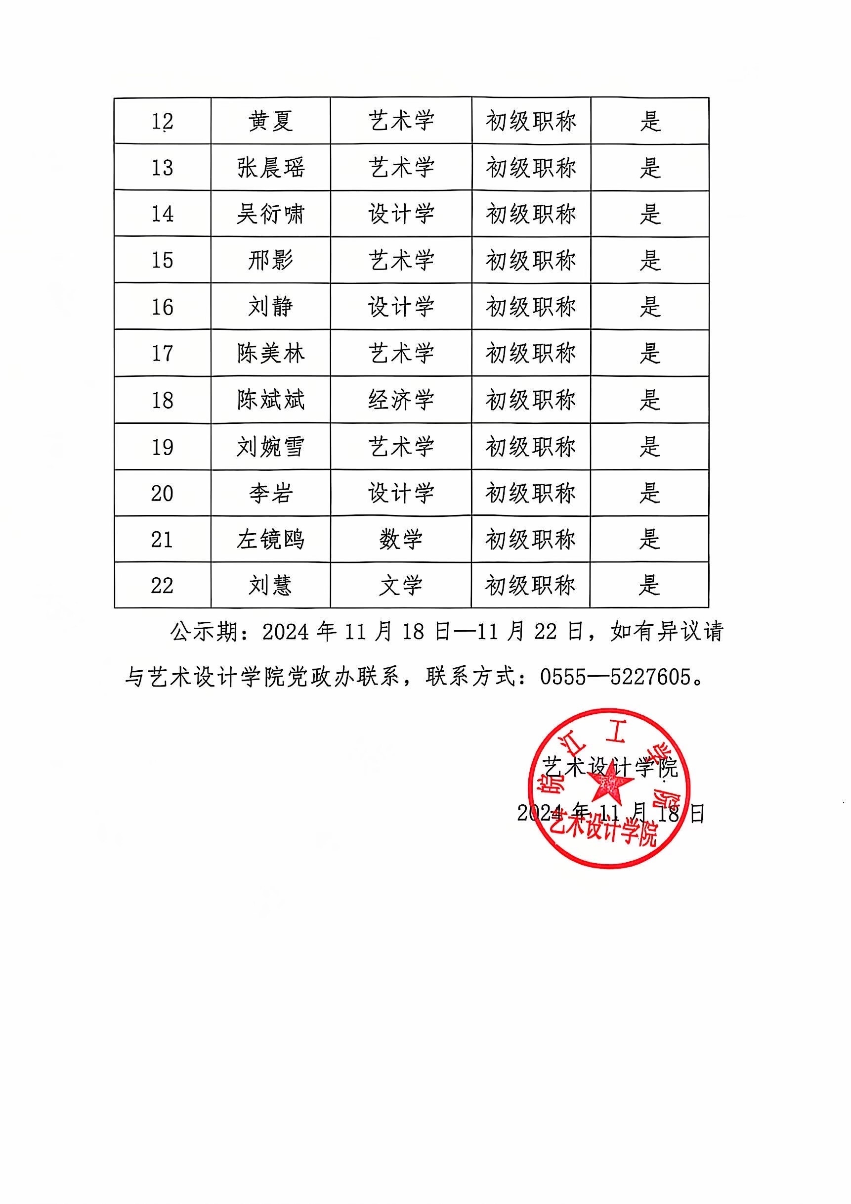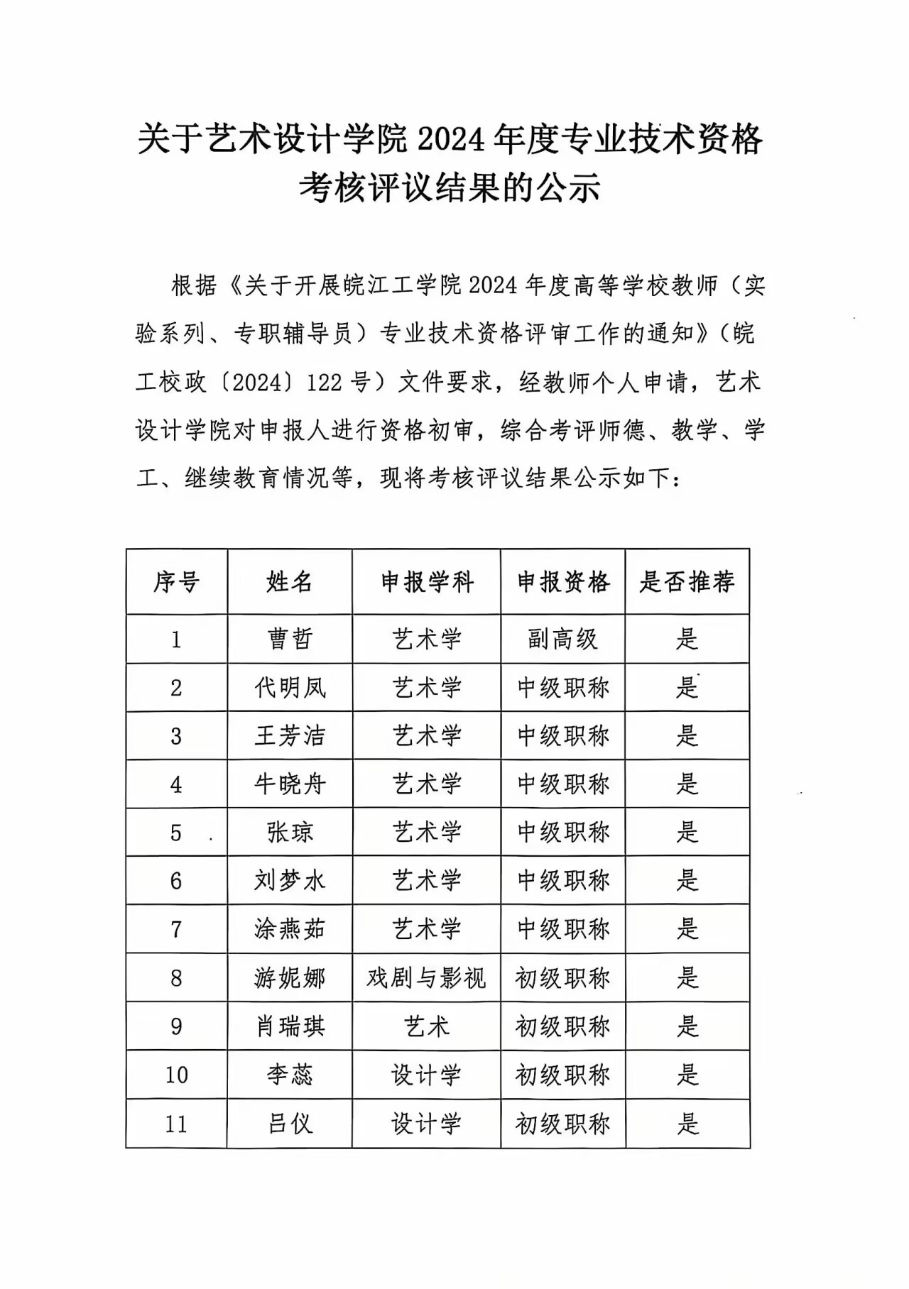 关于艺术设计学院2024年度专业技术资格考核评议结果的公示