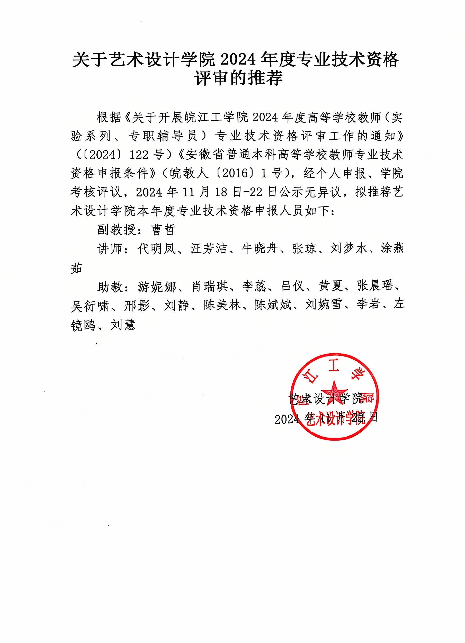 关于艺术设计学院2024年度专业技术资格评审的推荐