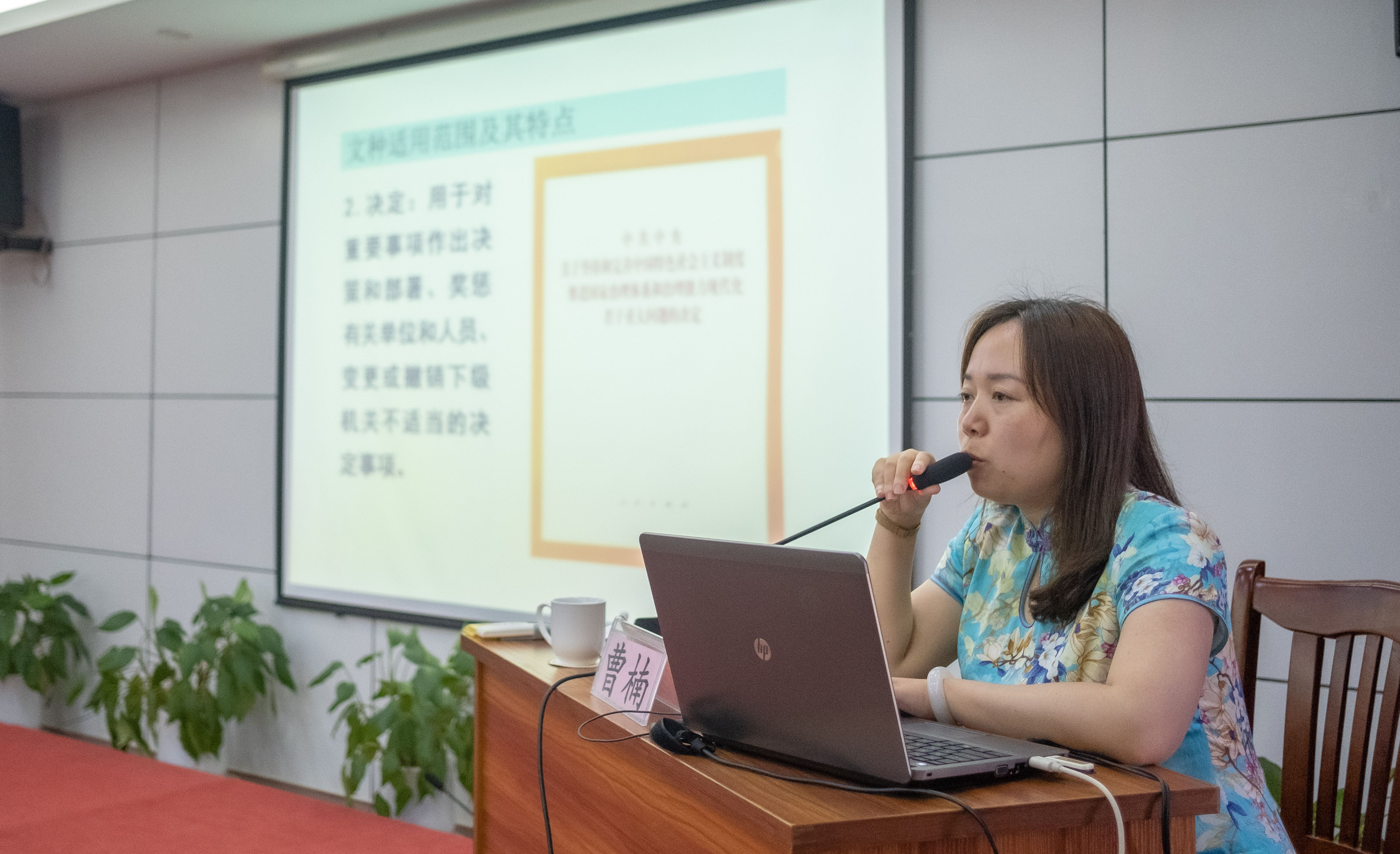 为学习贯彻十九届四中全会精神,进一步提高我校行政管理干部队伍特别是综合、文秘工作人员公文写作与应用能力,适应新形势下教育管理服务的需要,6月30日下午,我校举办了“公文写作与处理”讲座。市委办公室秘书科曹楠科长受邀就公文规范化办理进行授课。讲座由张建民副校长主持,学校各单位主要负责人、“三办”主任参加。