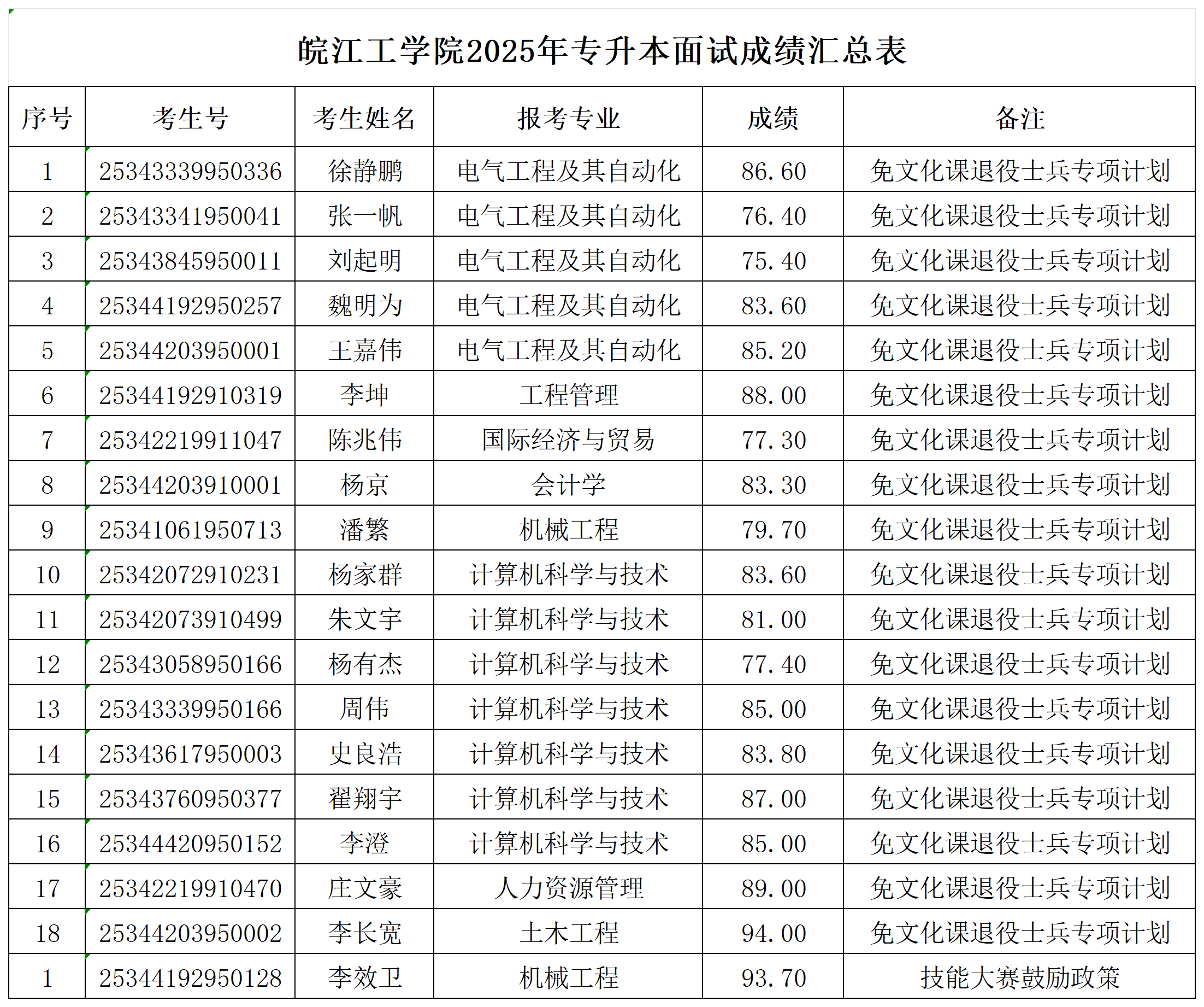 皖江工学院2025年免文化课退役士兵及职业技能大赛面试成绩公示